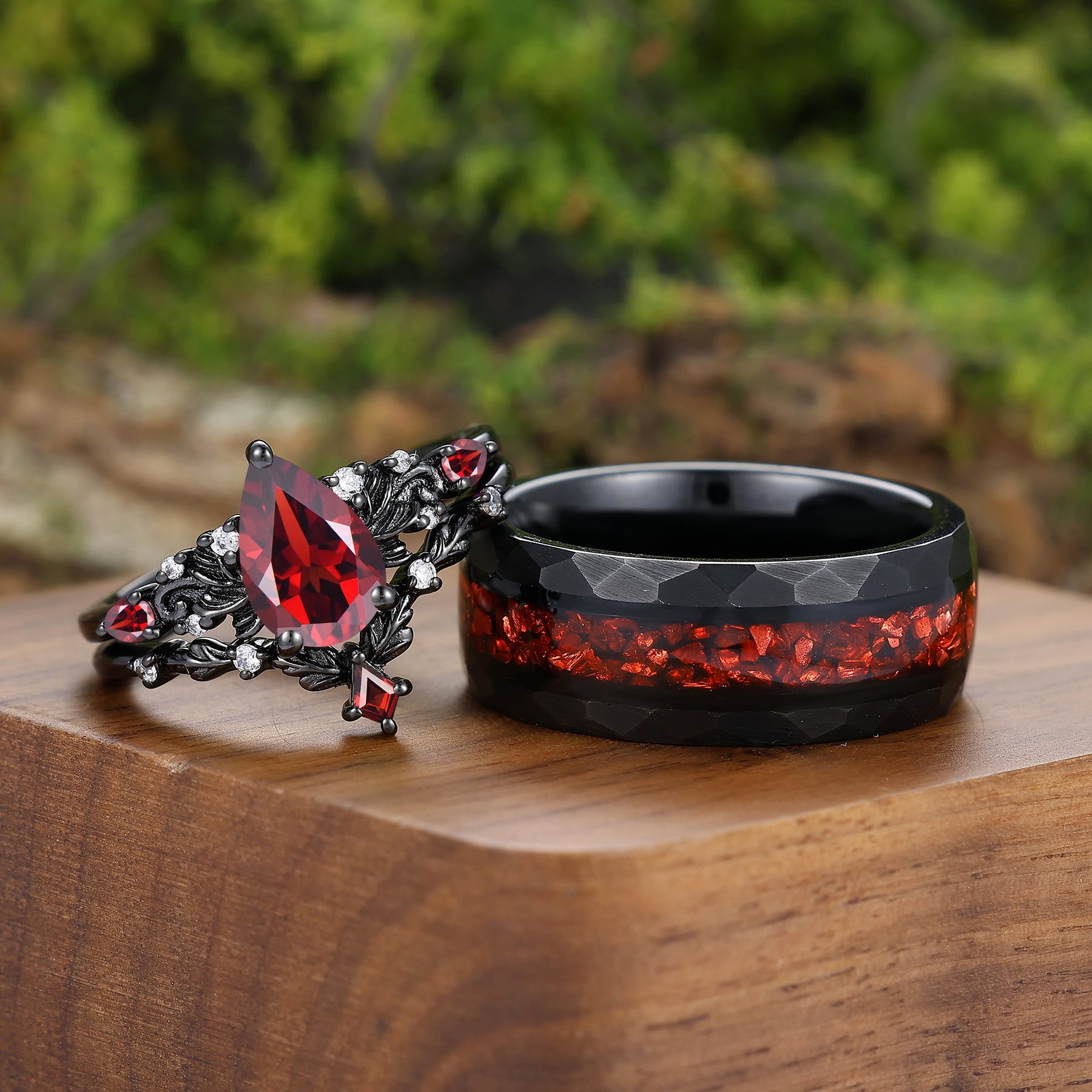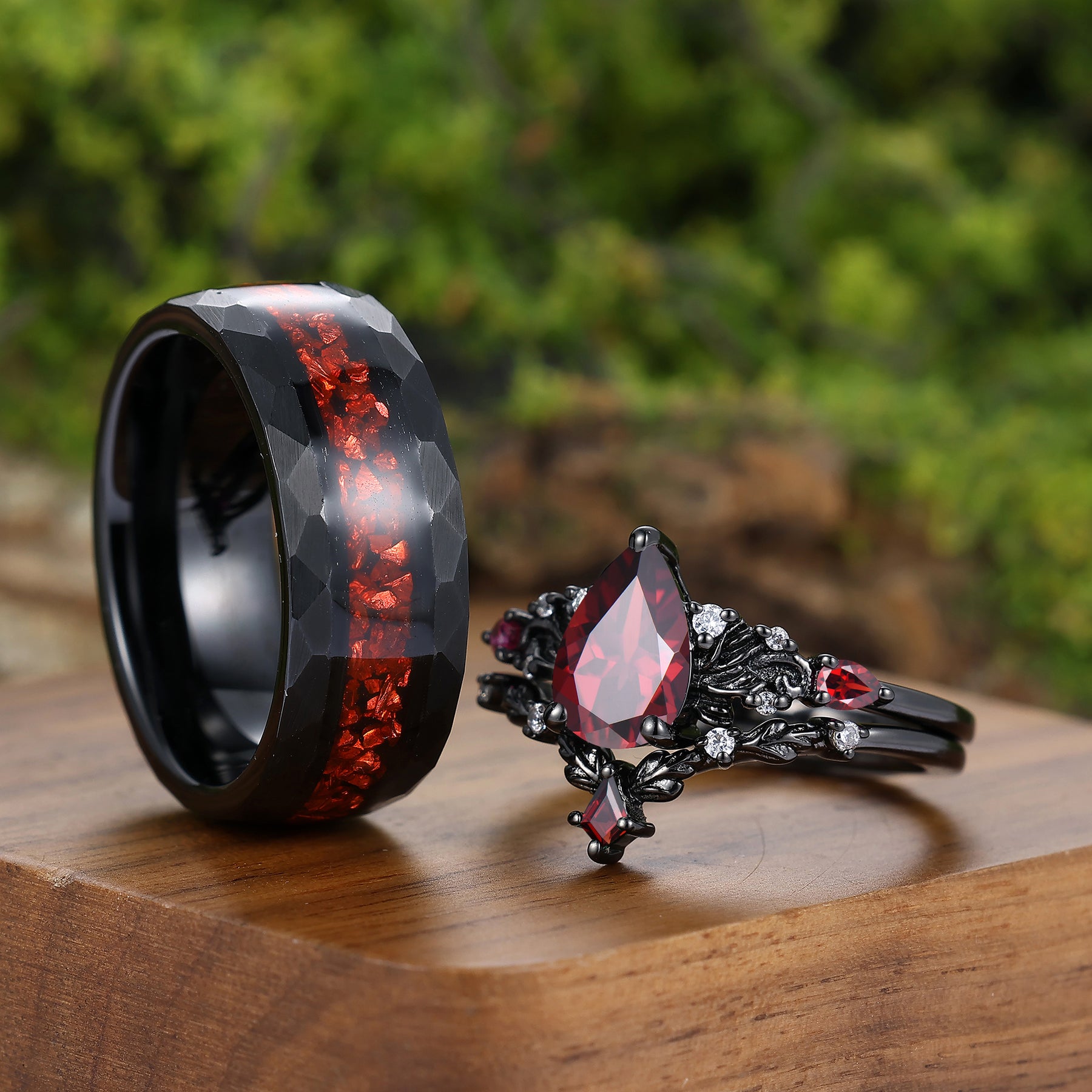Vintage Red Garnet Leaf Flourish Couple Ring Set Black 3 Piece His and Hers Wedding Ring Sets