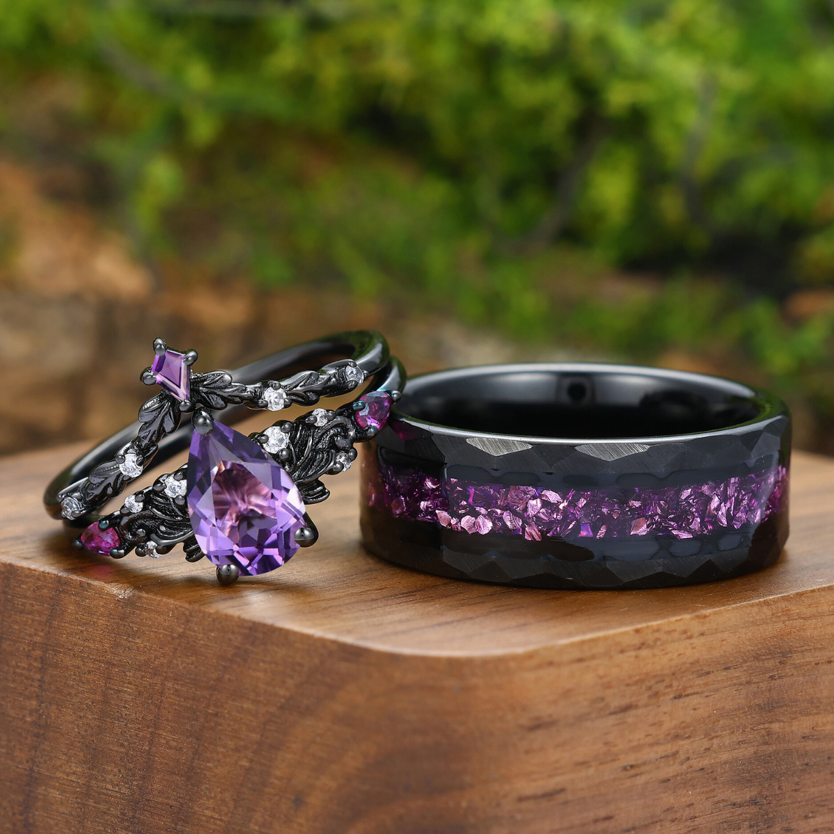 Scrollwork Natural Amethyst Rings For Couple Purple Amethyst Engraved Floral His And Hers Ring Set