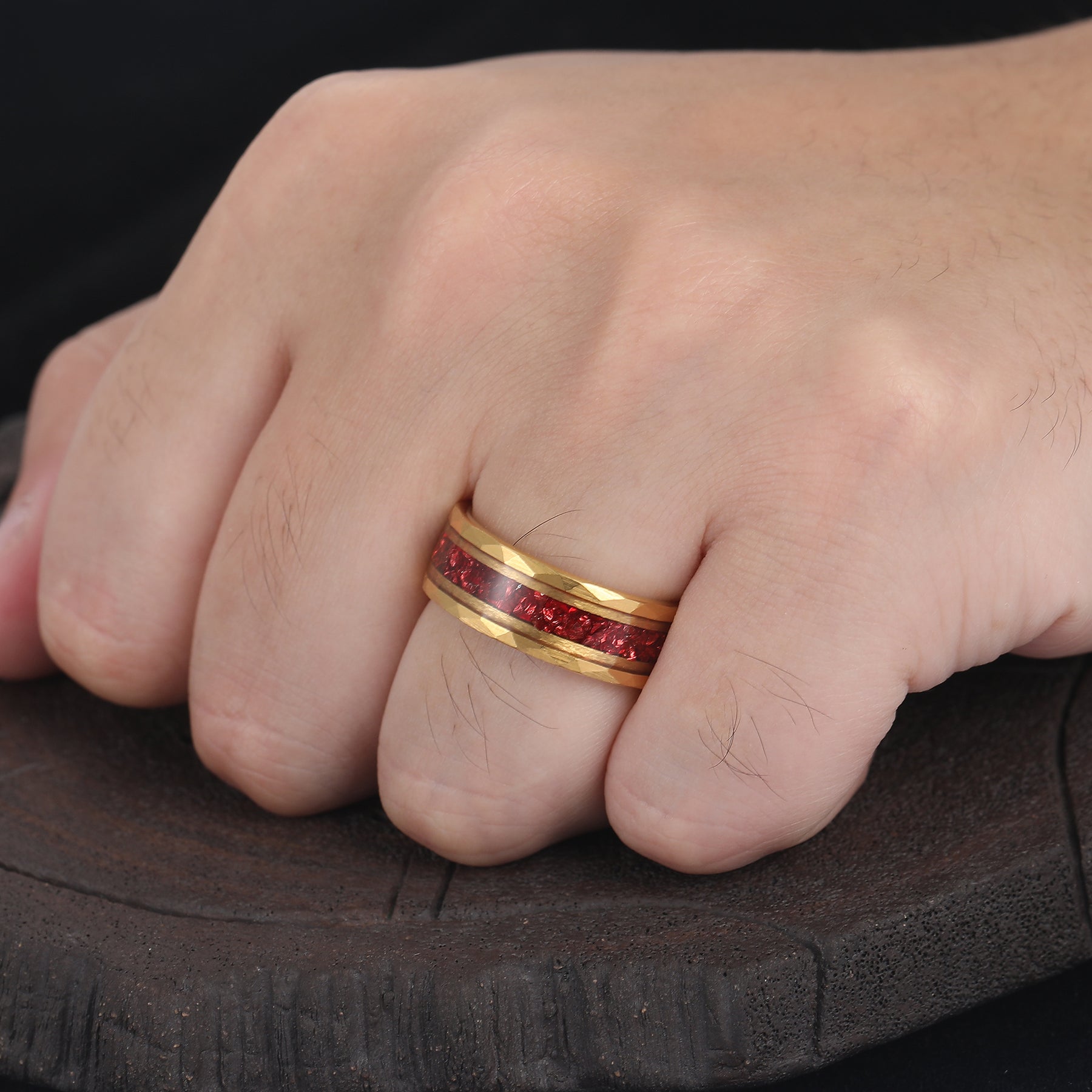 Metal Type: Tungsten Carbide - Crushed Lab Ruby Inlay - Hypoallergenic