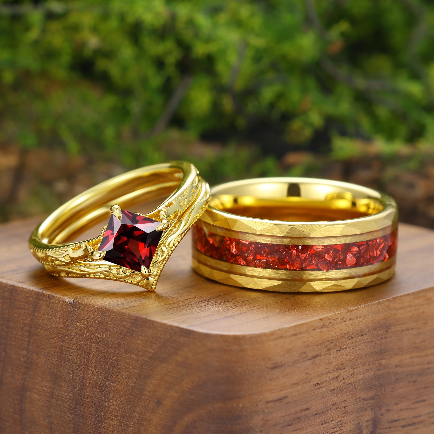 Solitaire Natural Red Garnet Engraved Couple Ring Set Vintage Filigreed Yellow Gold Plated His And Hers Rings