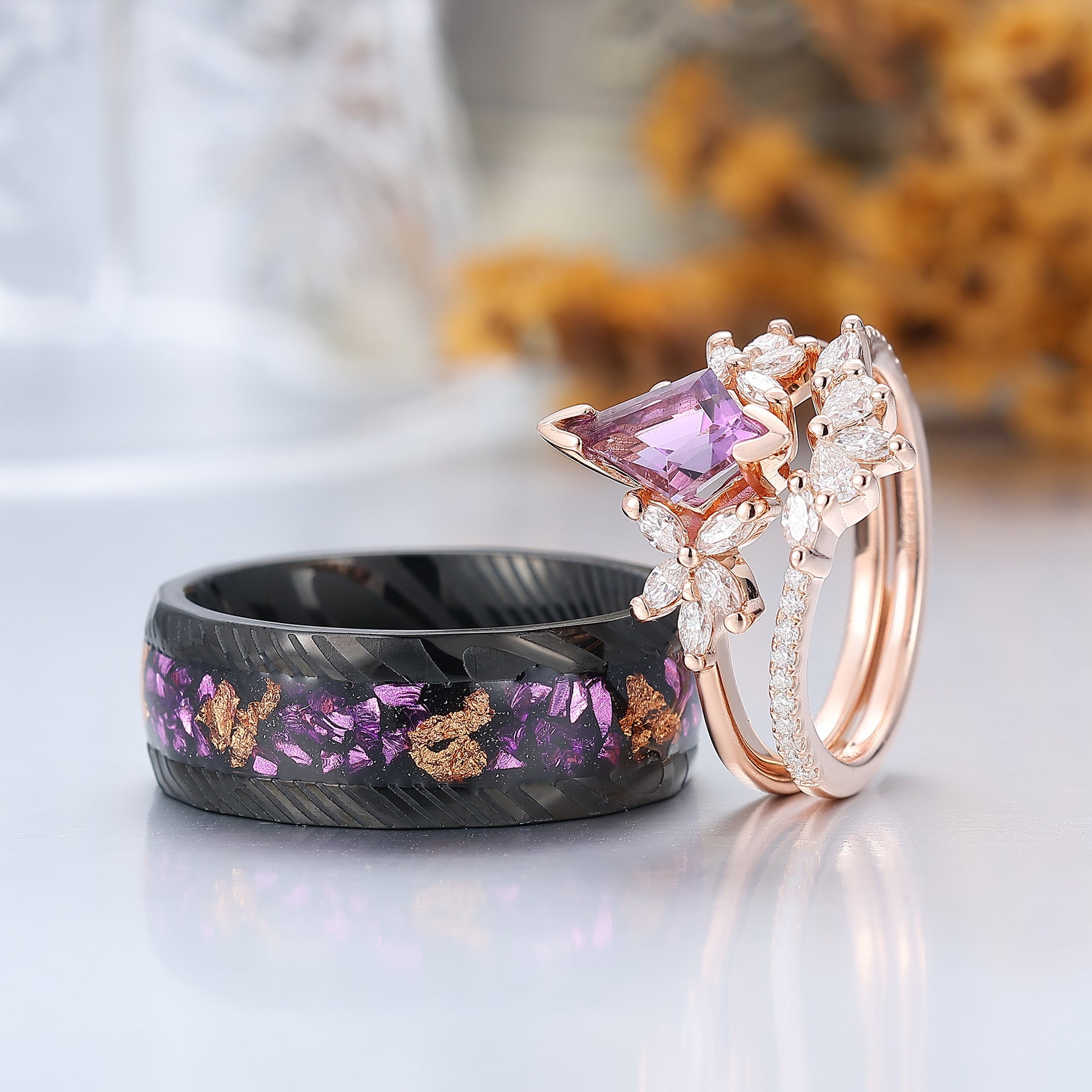Retro Petal Amethyst Engagement Couples Ring Set S925 And Damascus Steel His and Hers Promise Band