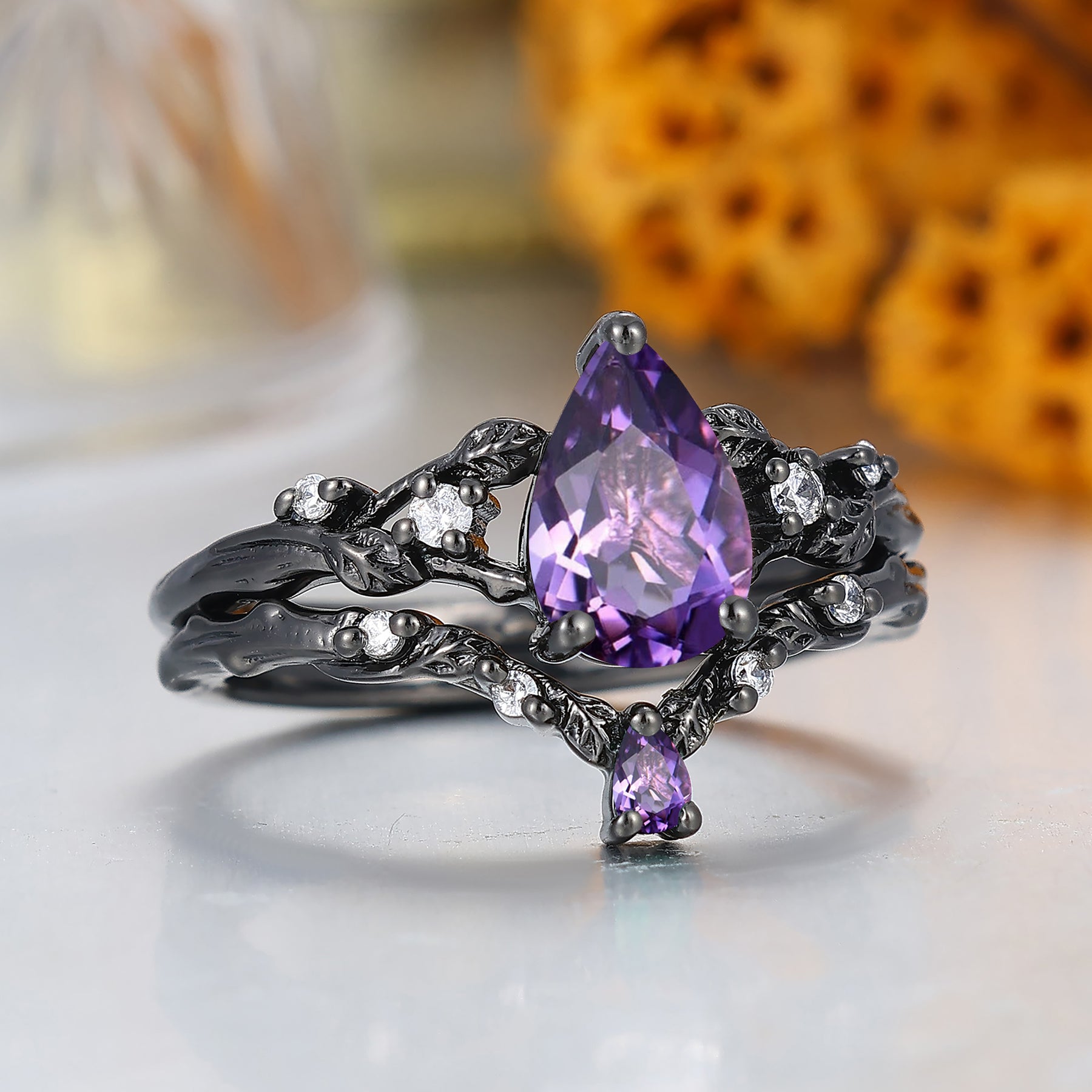 Unique Branch Leaf Engraved Natural Amethyst Engagement Ring Balck Plated Bridal Ring
