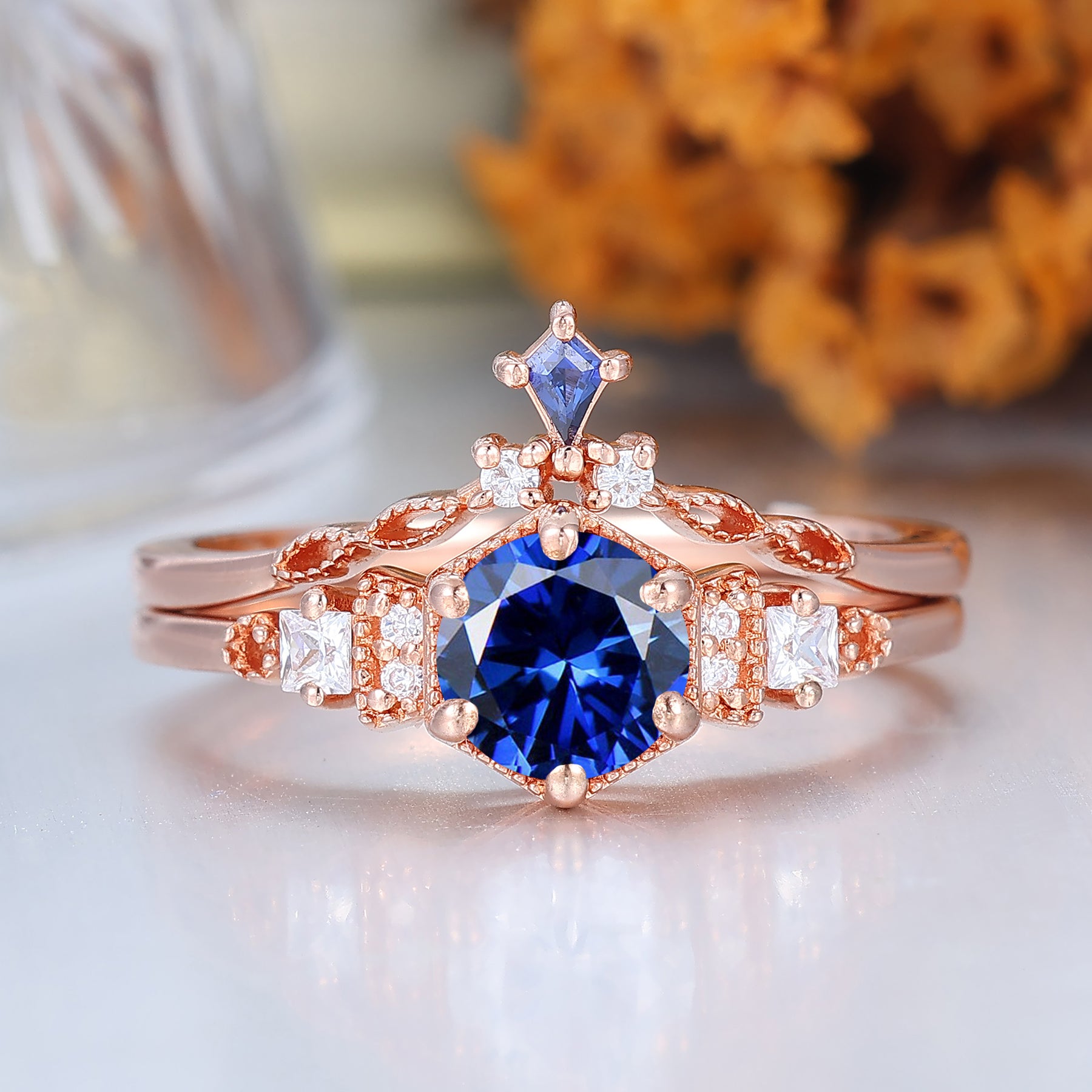Vintage Rose Gold Sapphire Ring Set Handmade Promise Anniversary Bridal Ring Sapphire Ring Set