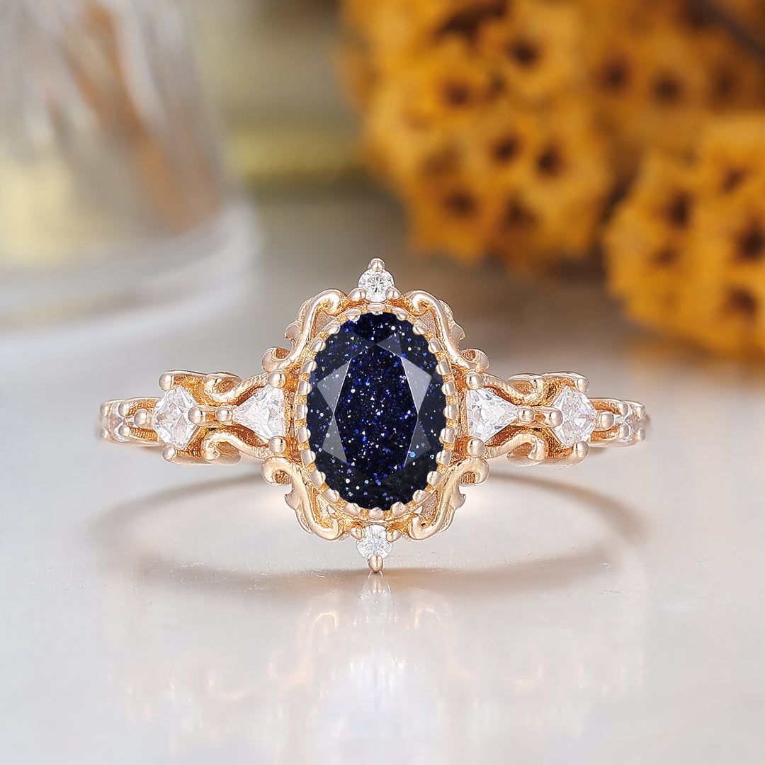 Capture the magic of the cosmos with blue sandstone engagement rings — a celestial choice for couples who dare to be different. With its deep azure depths and shimmering copper inclusions that mirror a starlit sky, blue sandstone (also known as blue goldstone) offers a unique alternative to traditional engagement stones. Symbolizing ambition, confidence, and inner light, these rings celebrate love that reaches for the stars.
