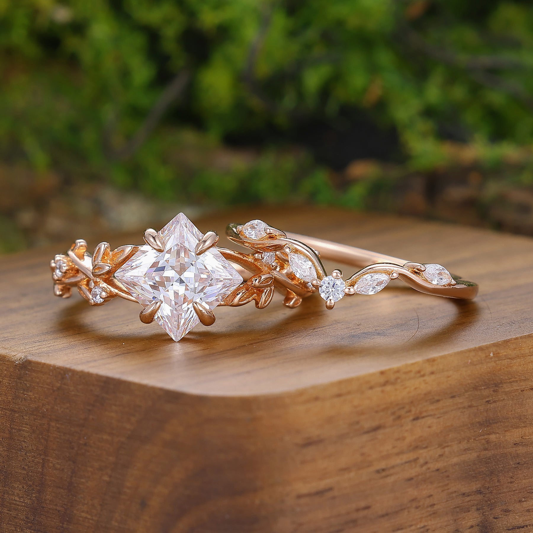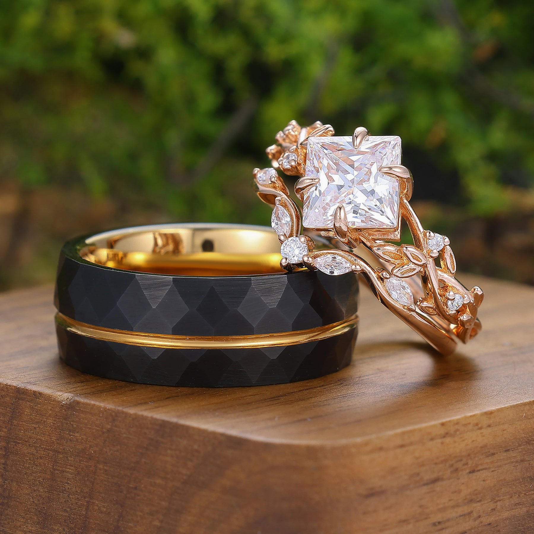 Vintage Princess Cut Moissanite Engagement Leaf Ring Set Matching Black Tungsten Couples Ring