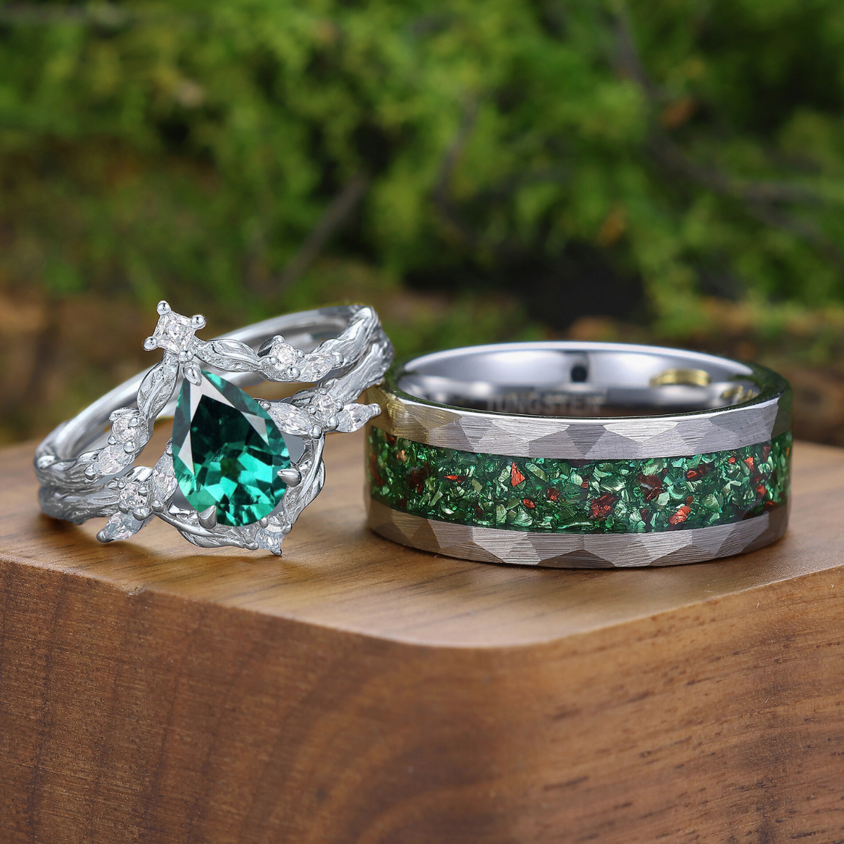 Exquisite Emerald Leaf Branch Couple Ring Set 3pcs Green His And Hers Rings Matching Ring For Women