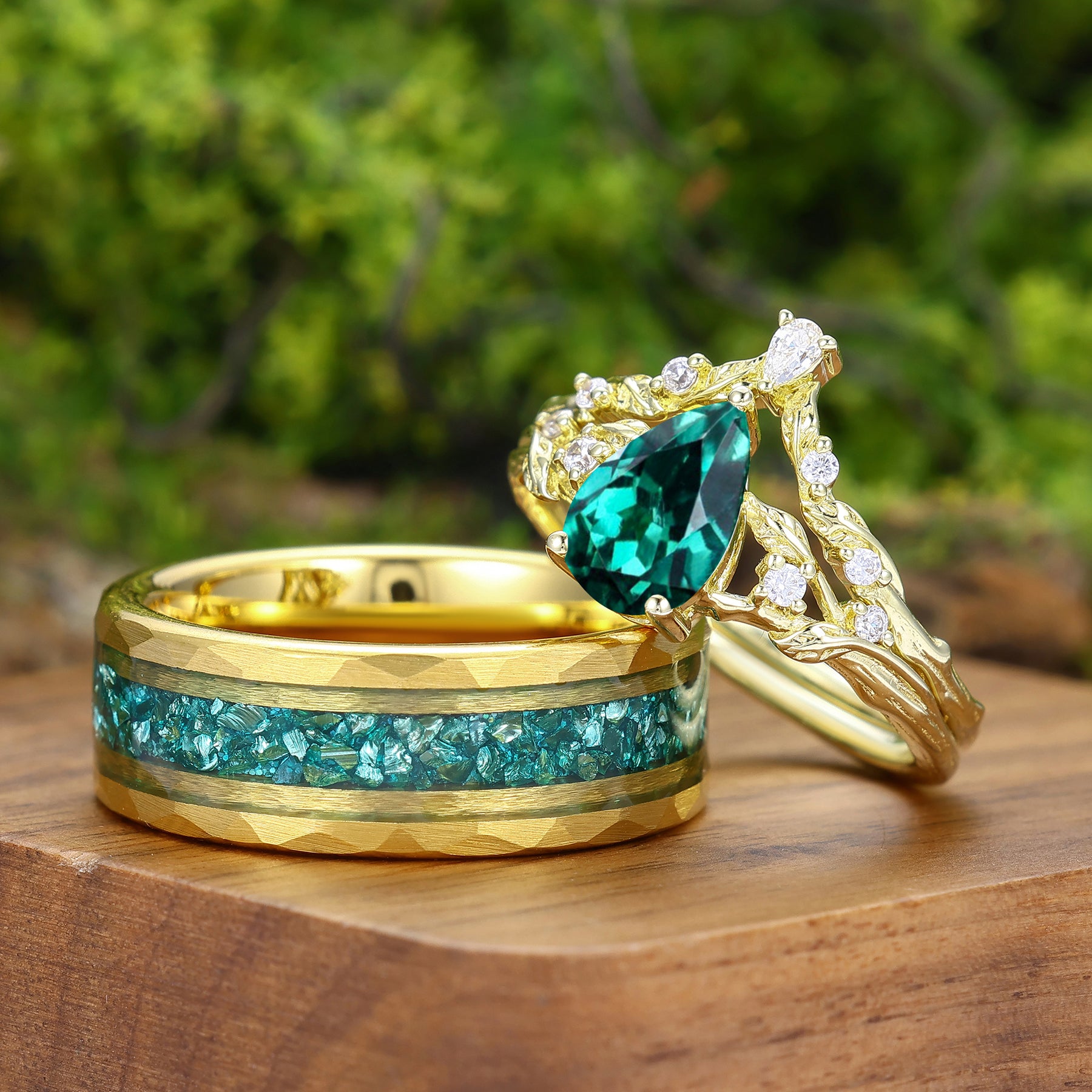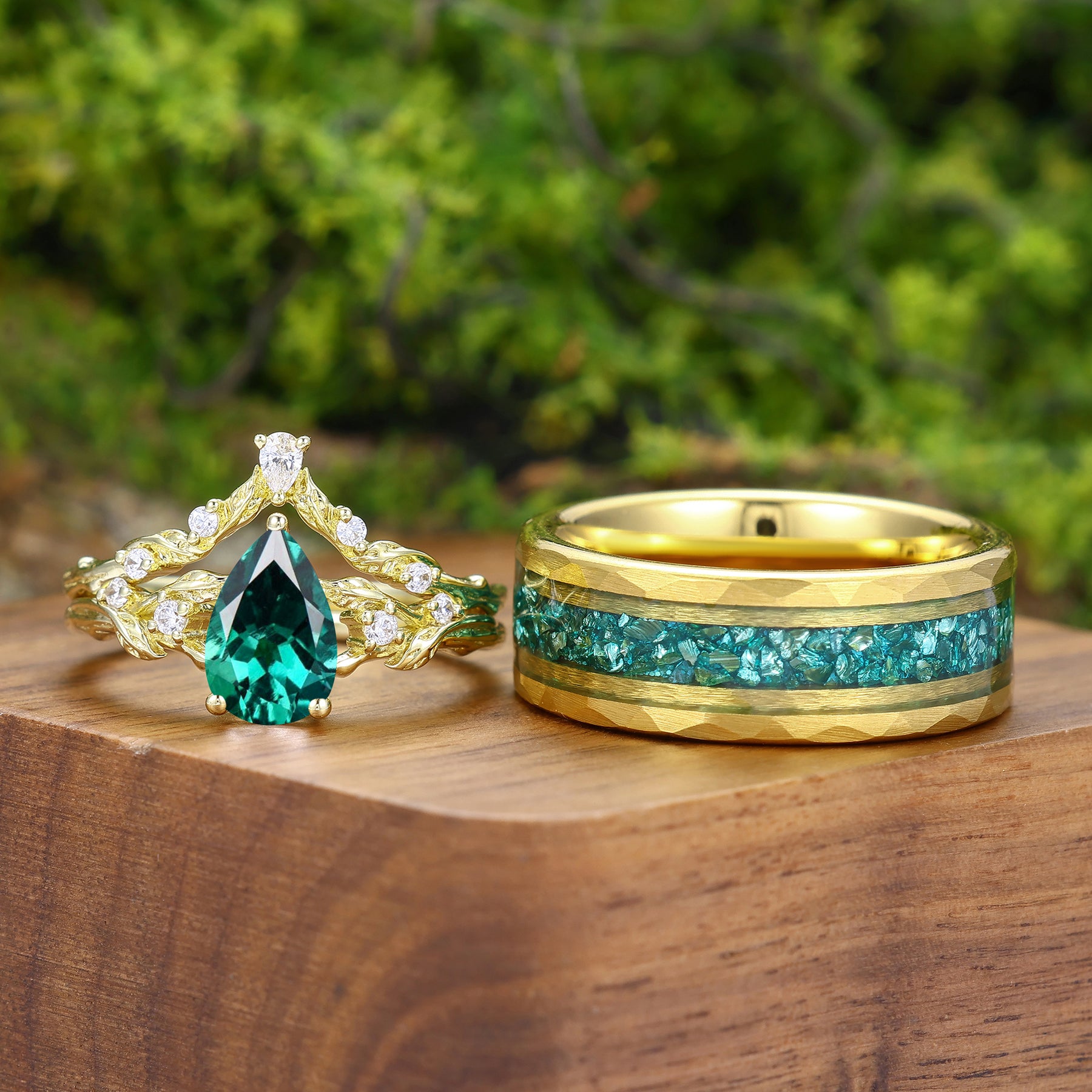 Nature Inspired Pear Cut Emerlad Couple Ring Set Yellow Gold Plated Marriage Ring Set