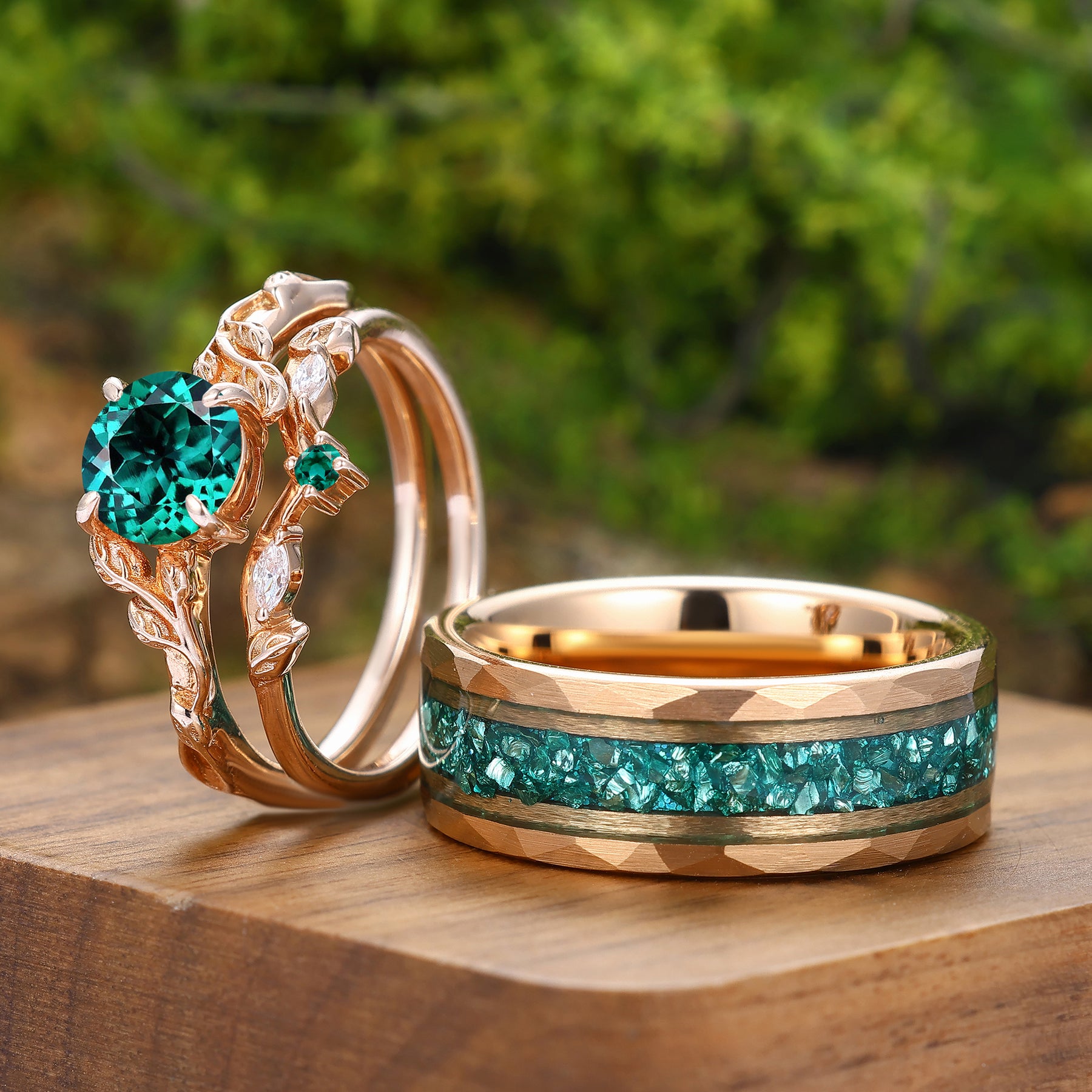 Unique Leaf Design Emerald Couple Rings Rose Gold Plated Matching Ring Set His And Hers Rings