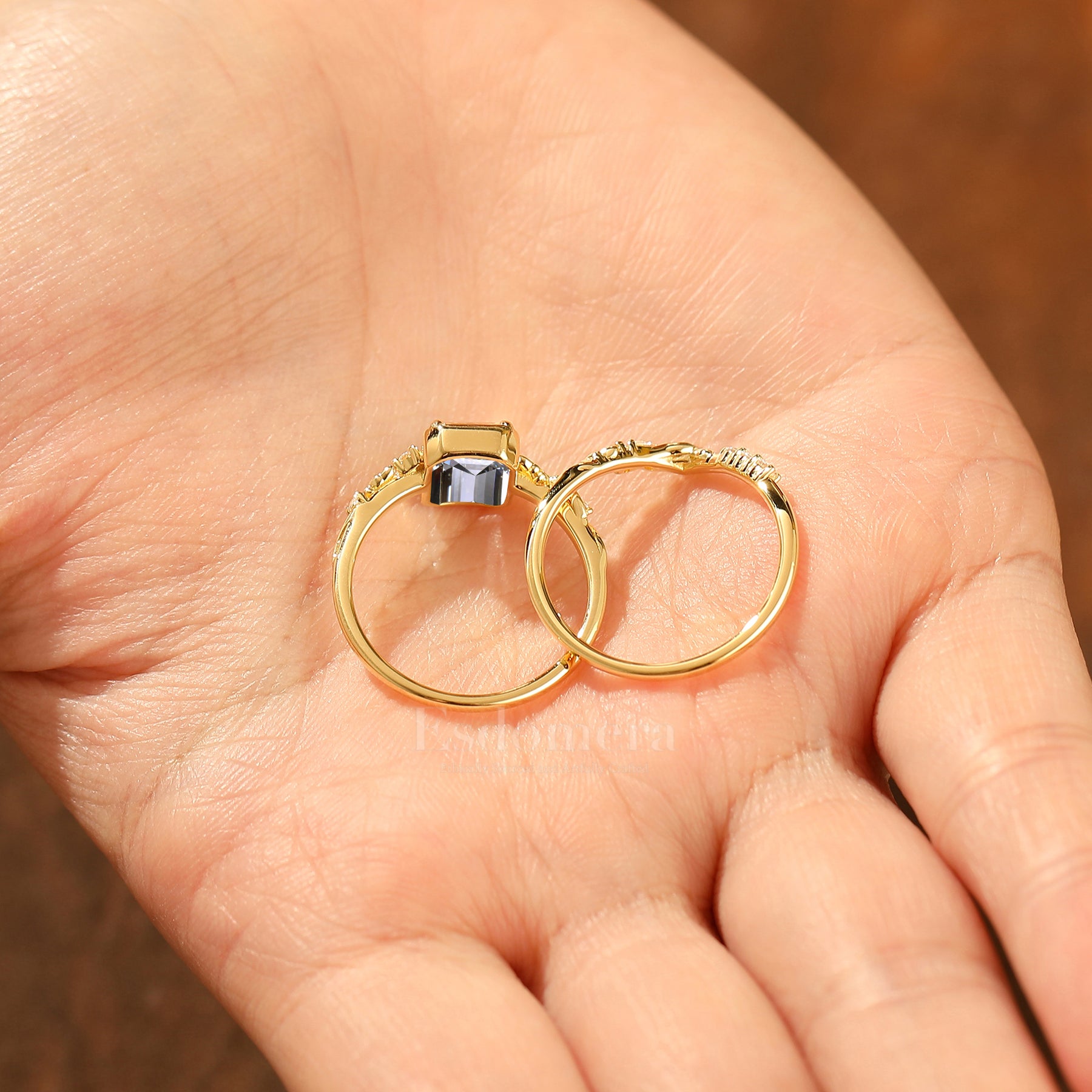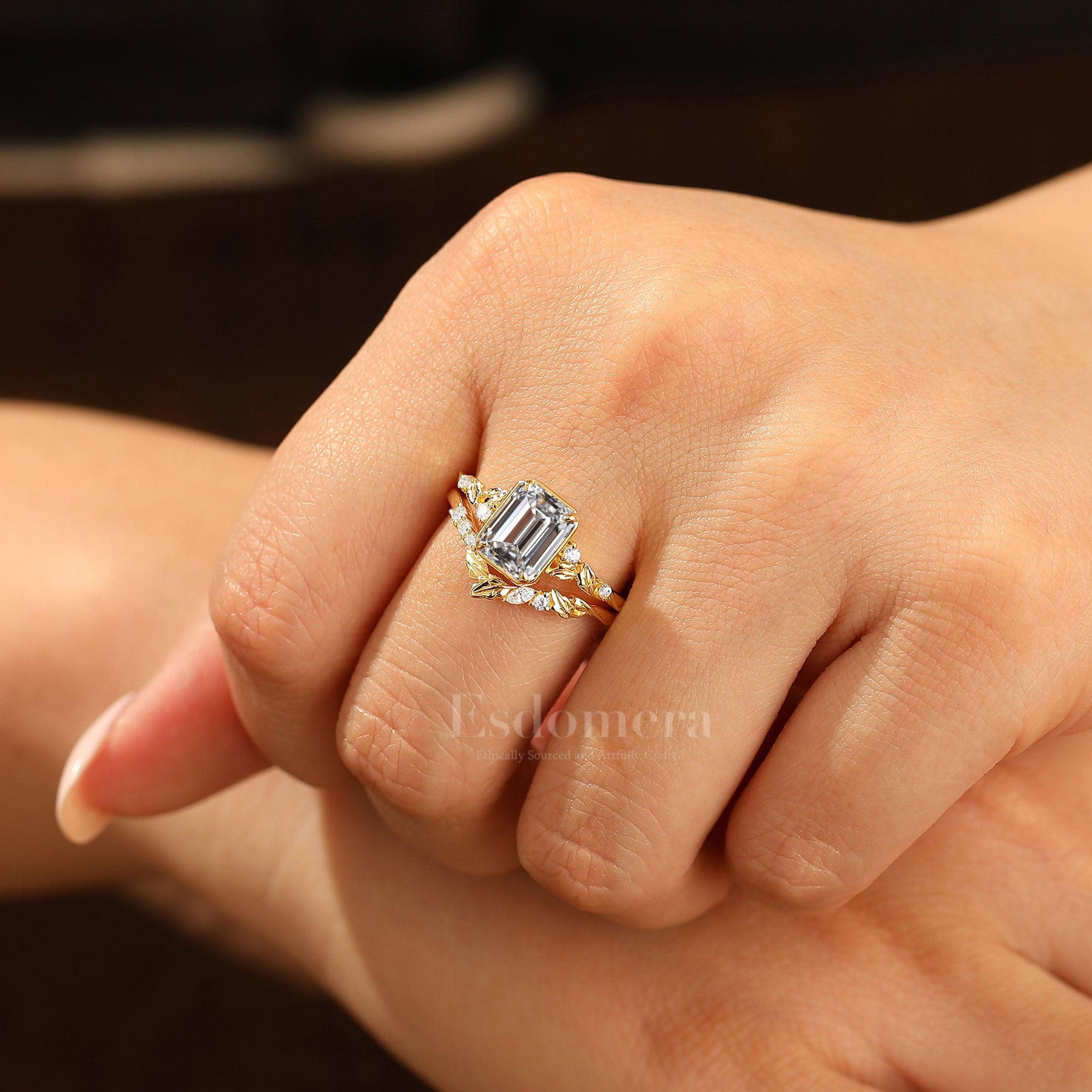 Vintage Leaf Emerald Lab Diamond Wedding Ring Set 2pcs 14K Gold Lab Grown Diamond Women Ring (IGI Certified)