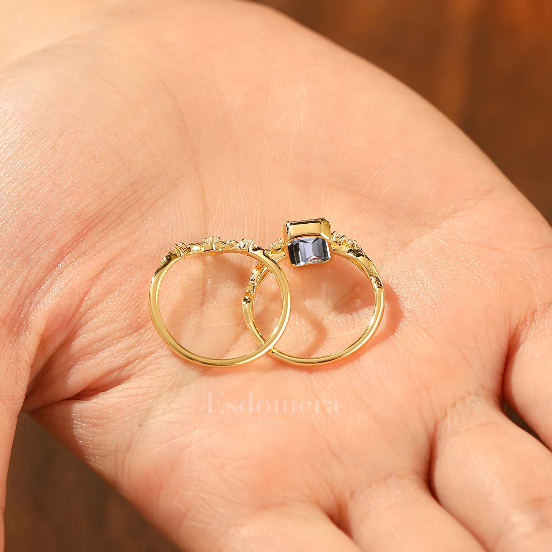 Art Deco Leaf Emerald Cut Lab Grown Diamond Engagement Ring Set Solid Yellow Gold Lab Diamond Rings (IGI Certified)
