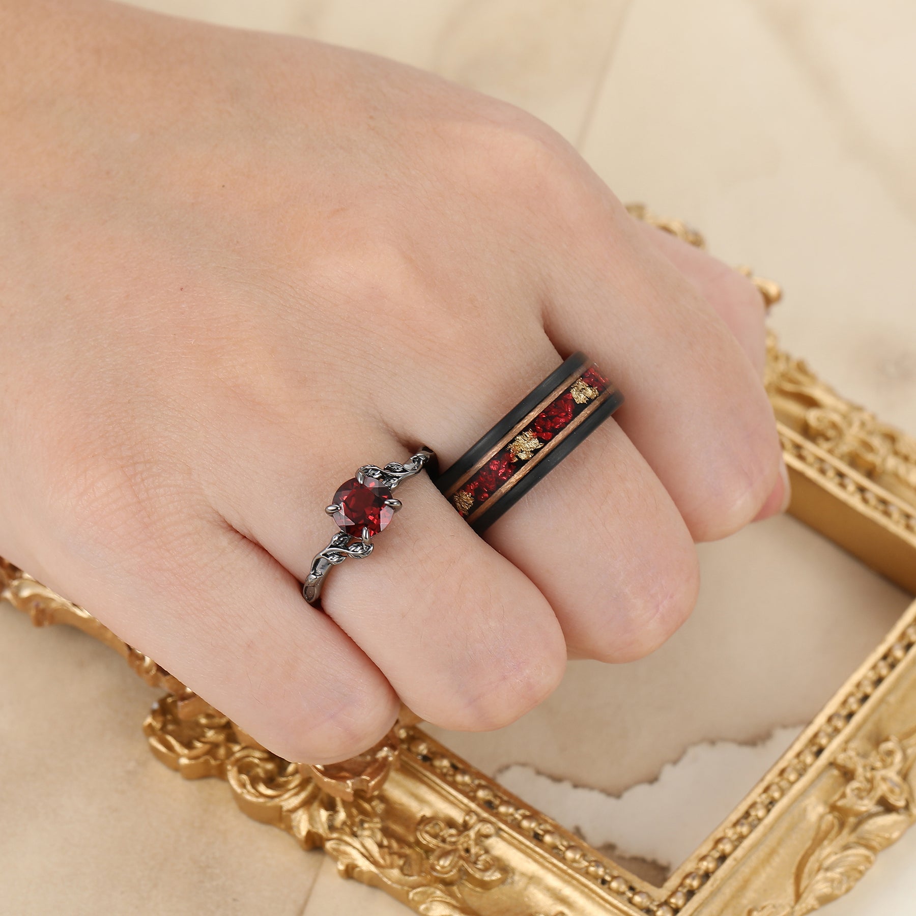 Unique Leaf Design Red Garnet Couple Rings Rose Gold Plated Matching Ring Set His And Hers Rings