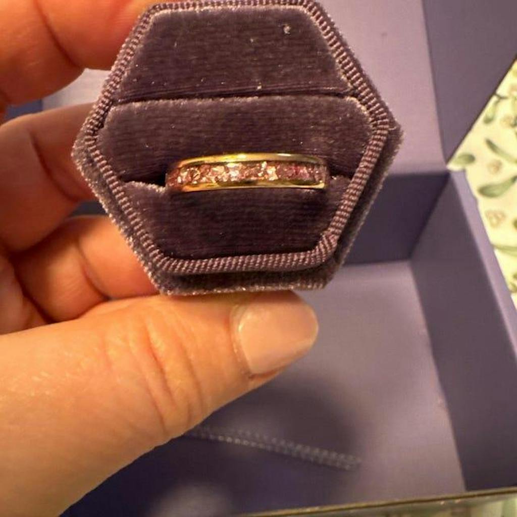 The ring is beautiful. The stones shine beautifully. The surface is very smooth and almost soft. It will be a beautiful wedding ring. Since I tend to retain water every summer, I will order a larger size.