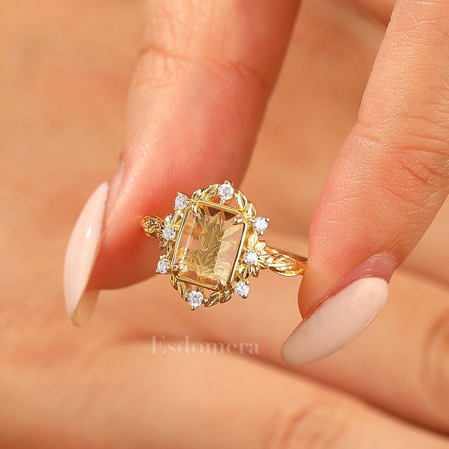 Leaf Style Flat-bottomed Moissanite Engagement Ring Unique Solid Yellow Gold Wedding Ring For Her