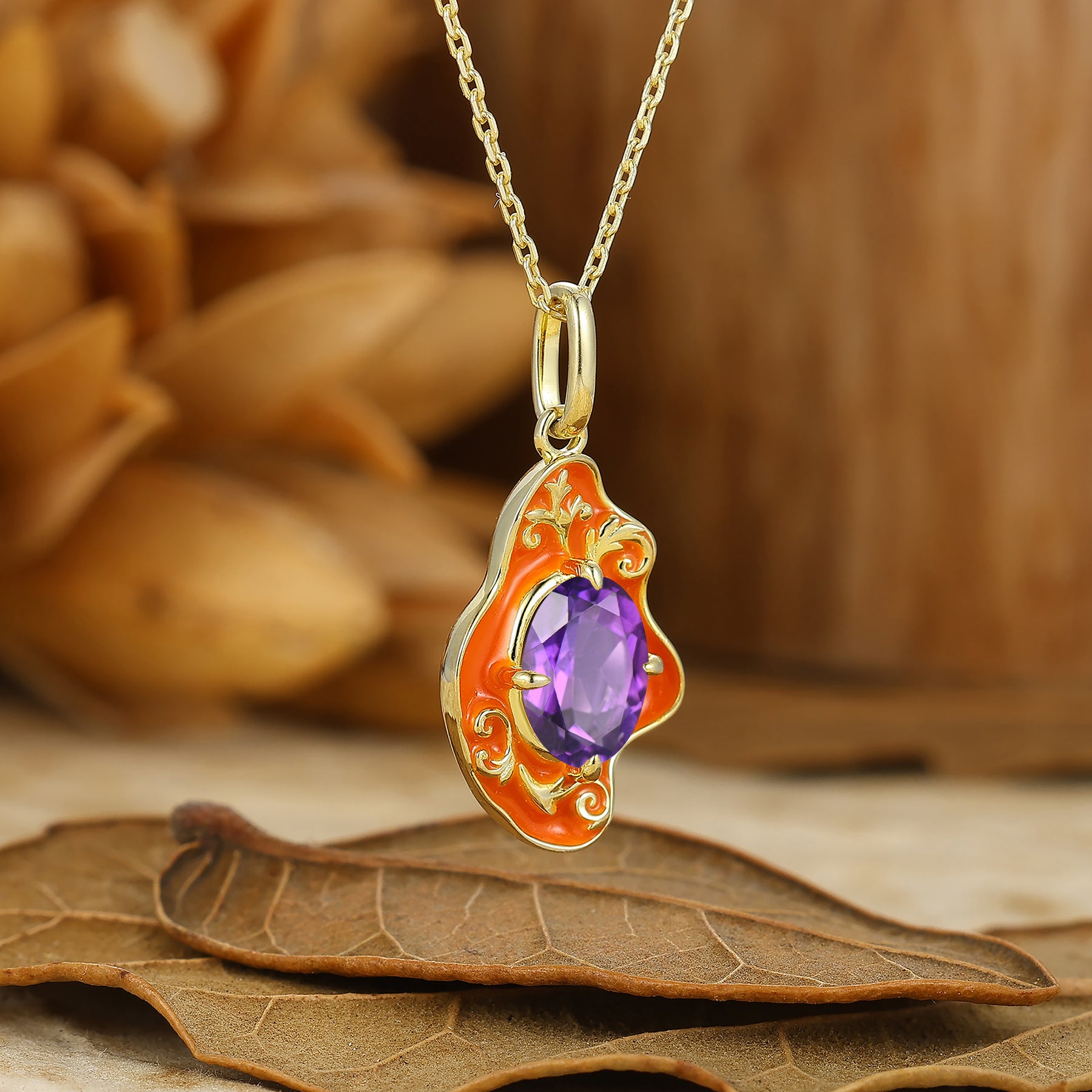 Elegant Oval Cut Amethyst Necklace Orange Resin Pendant 14K Solid Gold Necklace