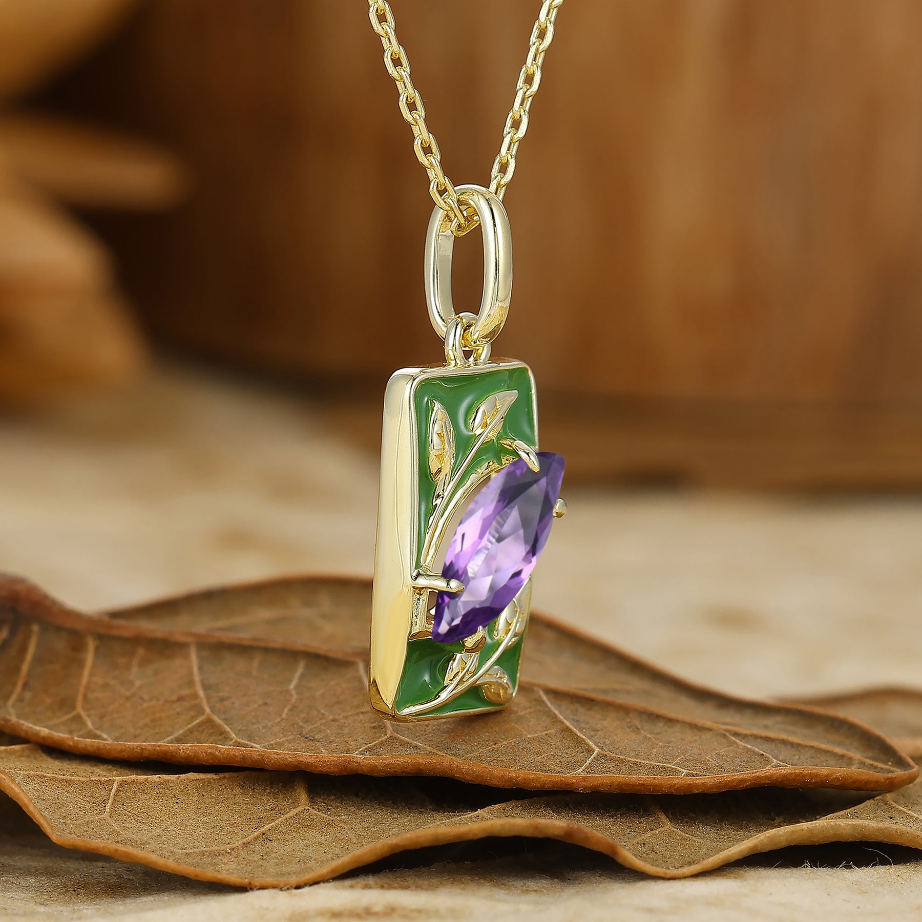 Vintage Marquise Cut Amethyst Pendant Vine Green Resin Women Necklace