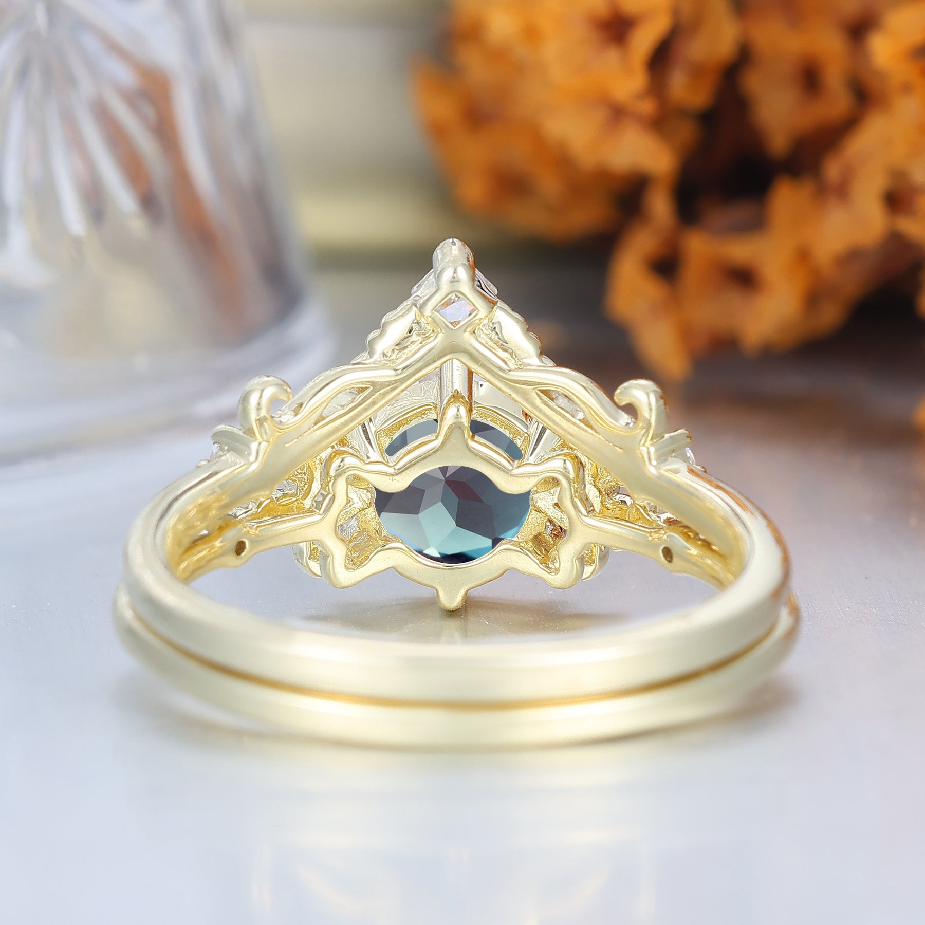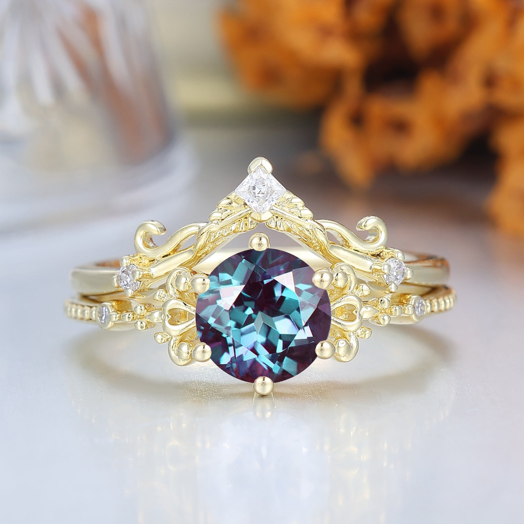 Artsy Milgrain Alexandrite Floral Ring Set Vine Design 14K Gold Alexandrite Women Rings