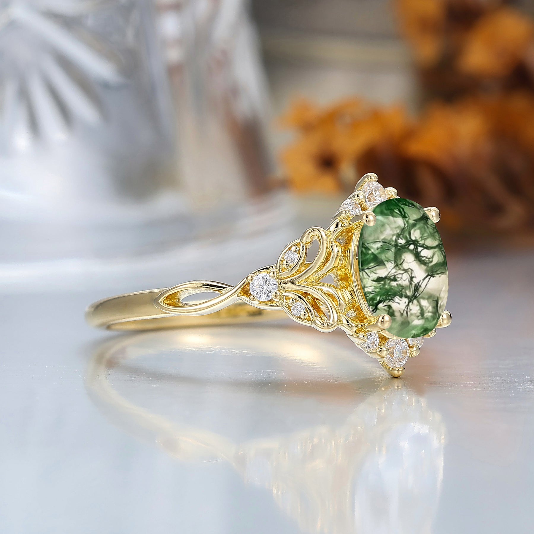 Elegant Oval Cut Moss Agate Wedding Ring 14K Yellow Gold Cluster Leaf Design Bridal Ring