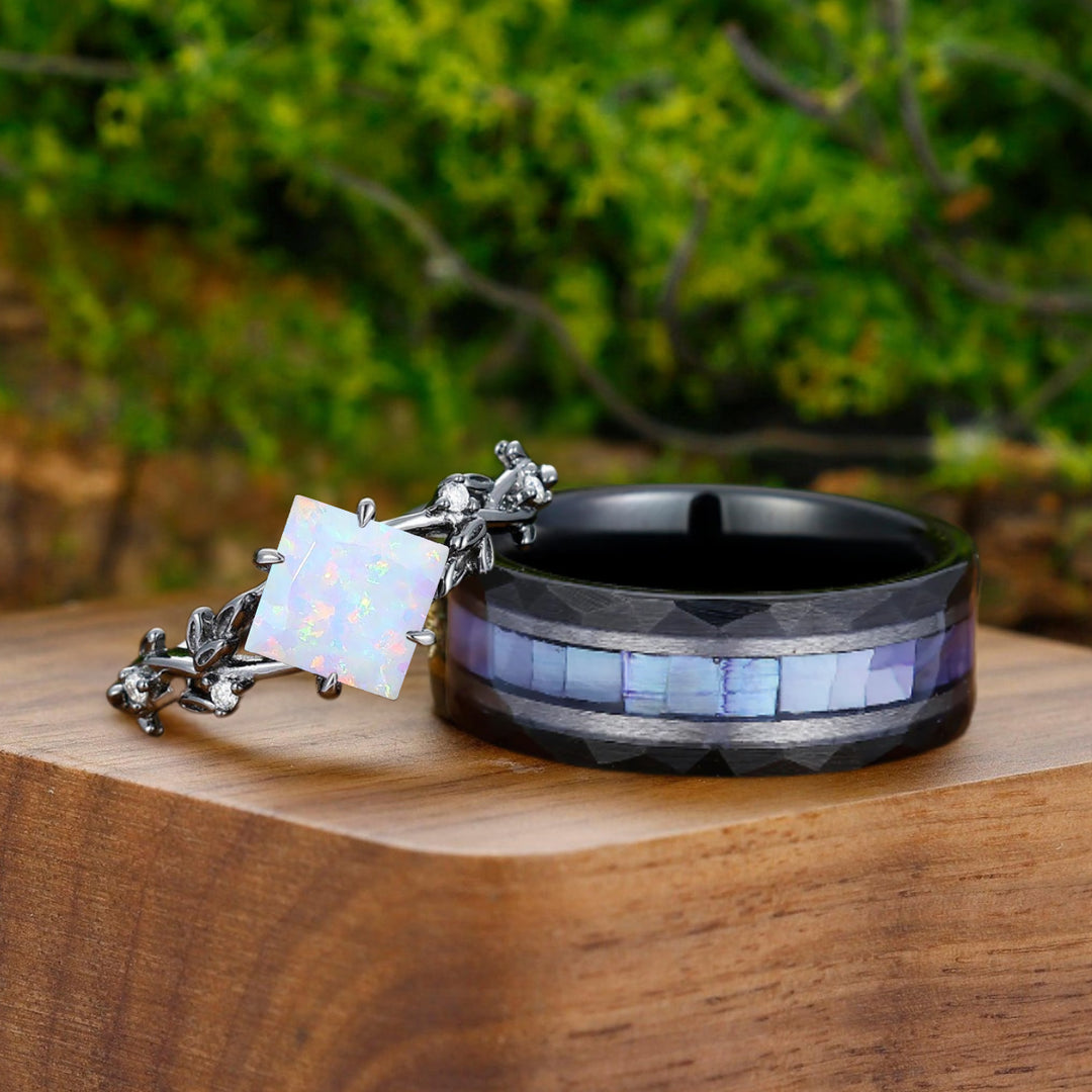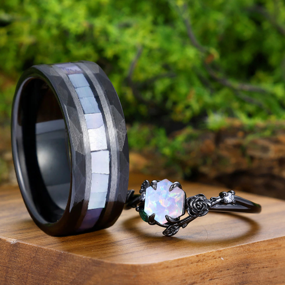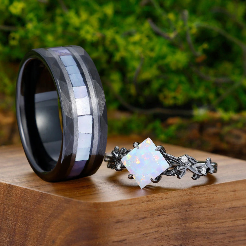 An opal couple ring set is for the couple who wants a symbol that is truly unlike any other. Known for its spectacular "play-of-color," each opal flashes with a unique spectrum of vibrant hues that dance and shift with the light. This means your ring and your partner's ring will be a perfectly coordinated, yet distinctly individual pair—a beautiful metaphor for a successful partnership.