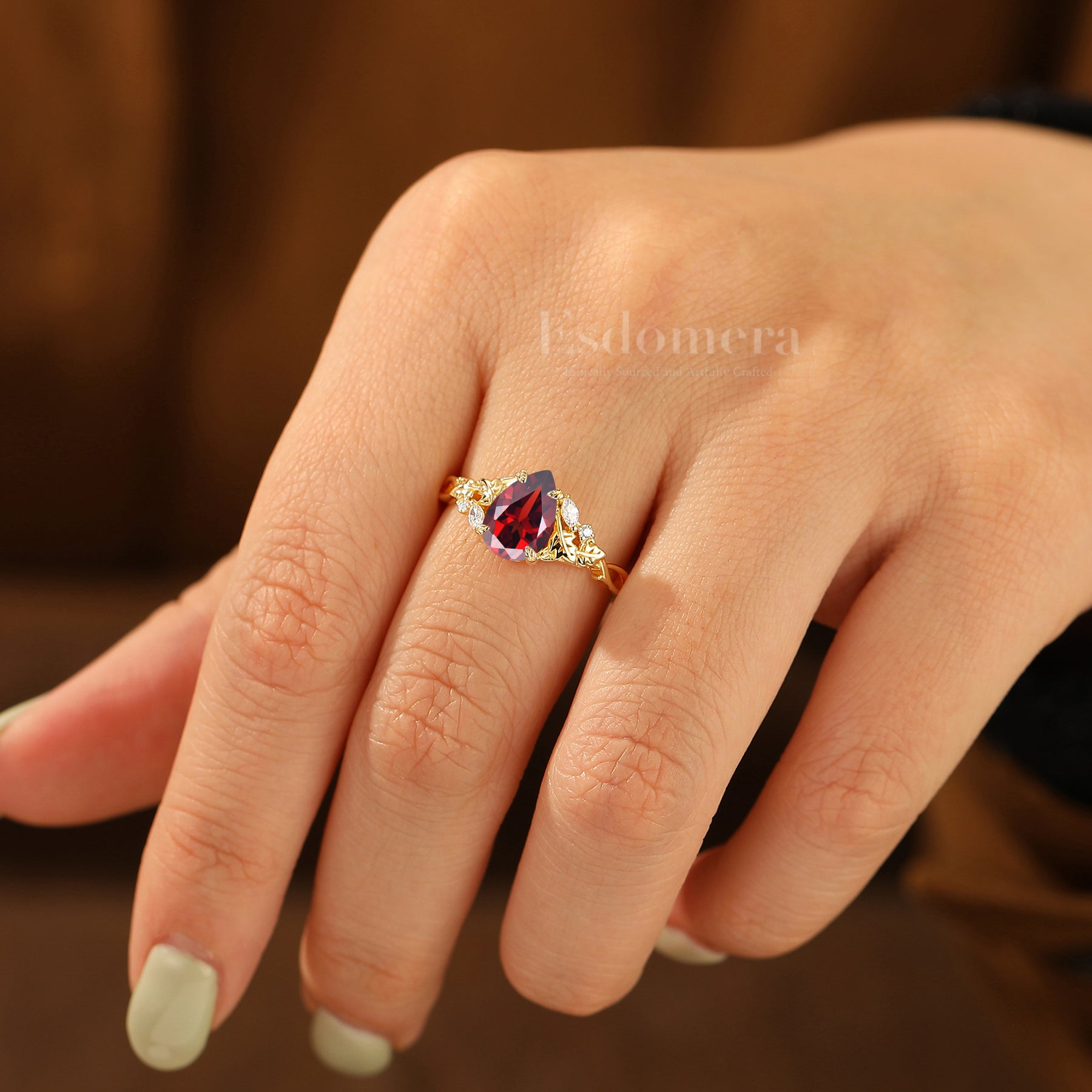 Leaf Sprig Pear Cut Red Garnet Bridal Ring Vintage S925 Engagement Ring Solid Gold Women Ring