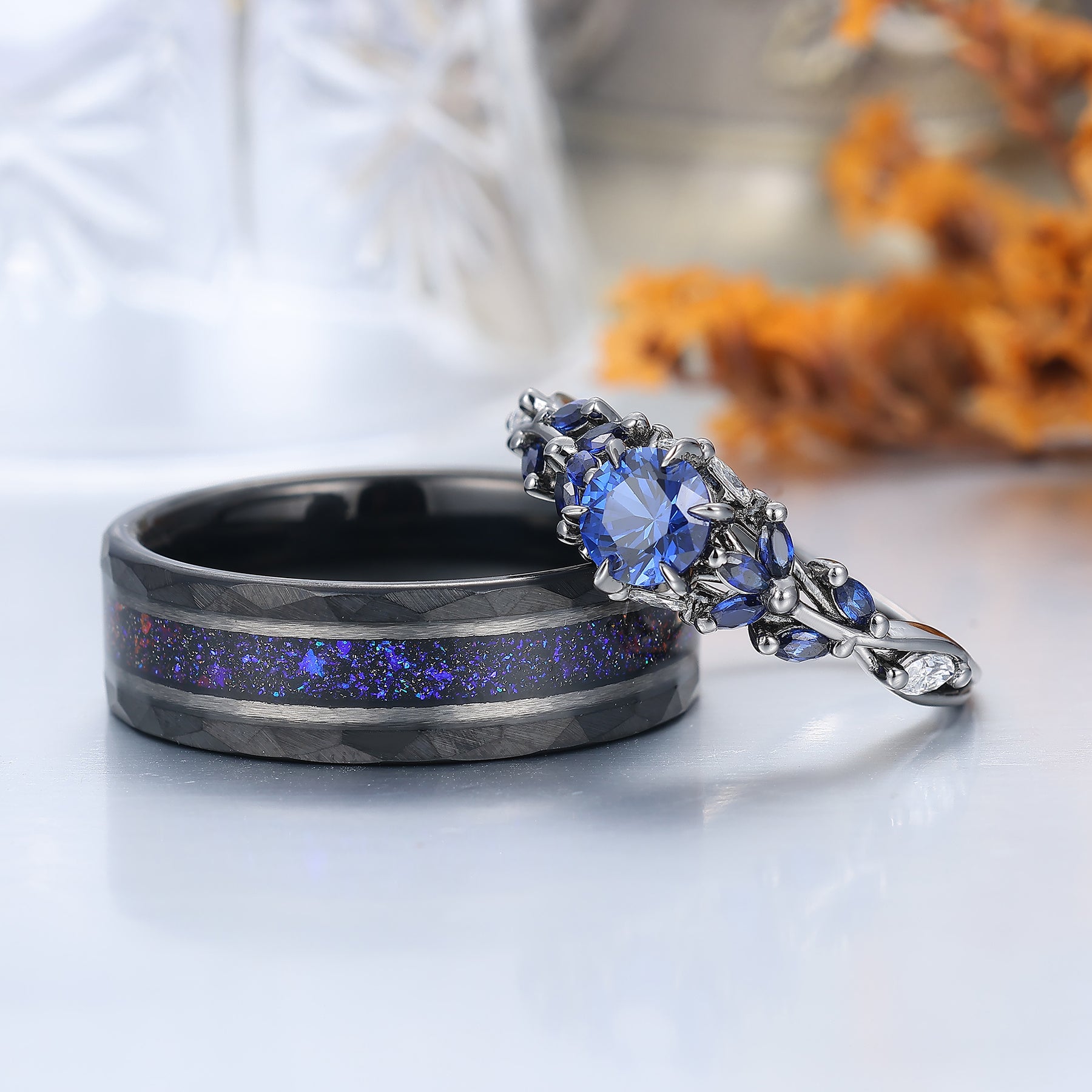 Gorgeous Curved Sapphire Stem Engagement Rings For Couples Modern Blue Tungsten Couple's Set Anniversary Wedding Band