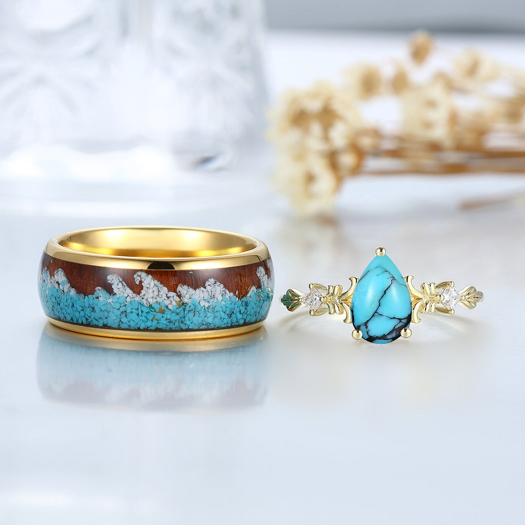 Art Deco Scrollwork Pear Cut Natural Turquoise Promise Couple Ring Set His And Hers Rings