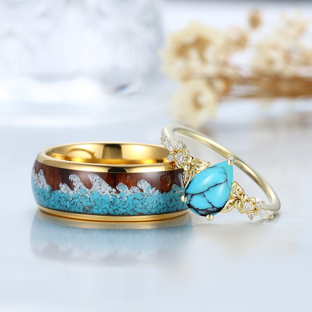 Turquoise Leaf Inspired Couple Rings Blue And Yellow Gold Plated Rings For Him And Her