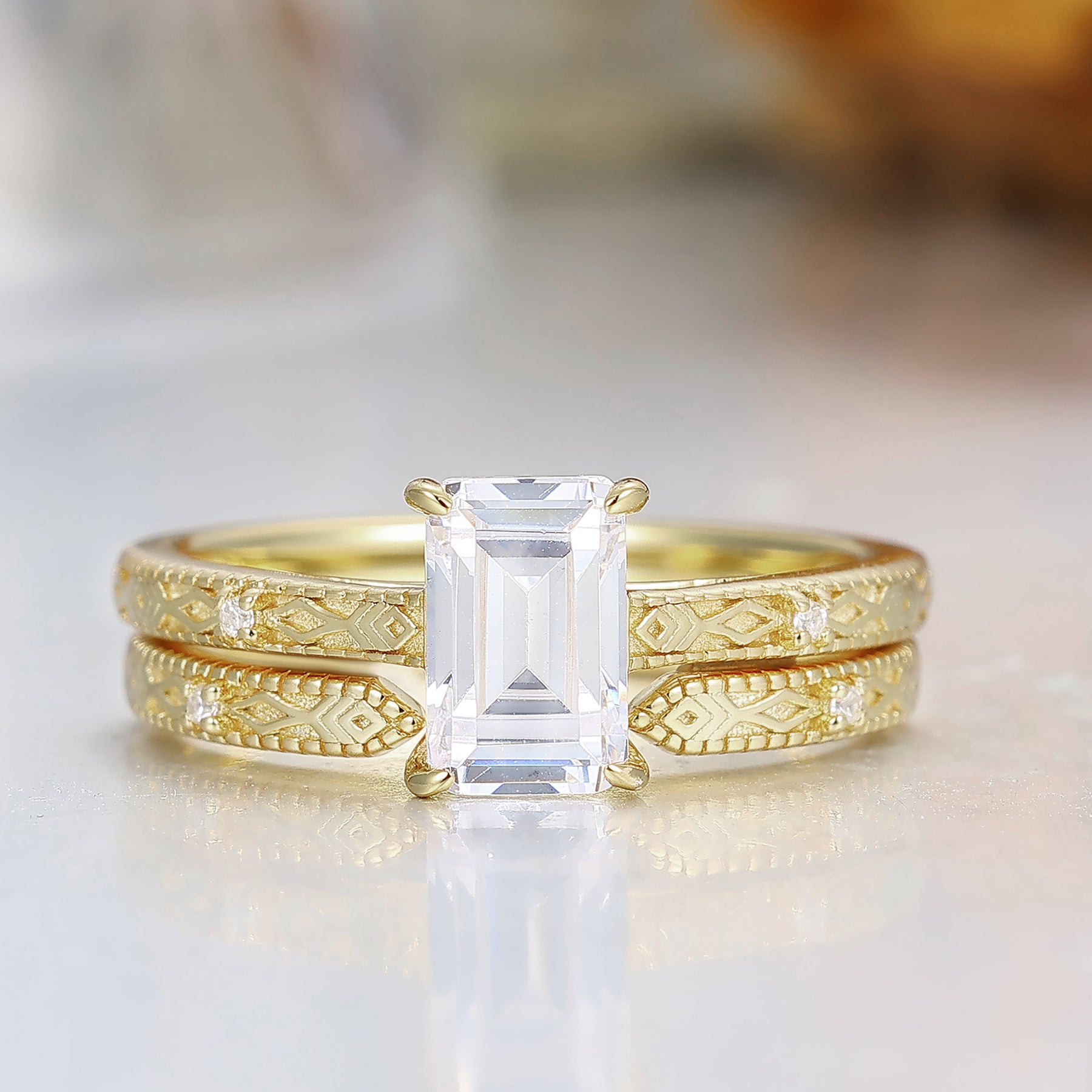 Pattern Engraved Moissanite Wedding Ring Set Antique 14K Yellow Solid Gold Engagement Ring