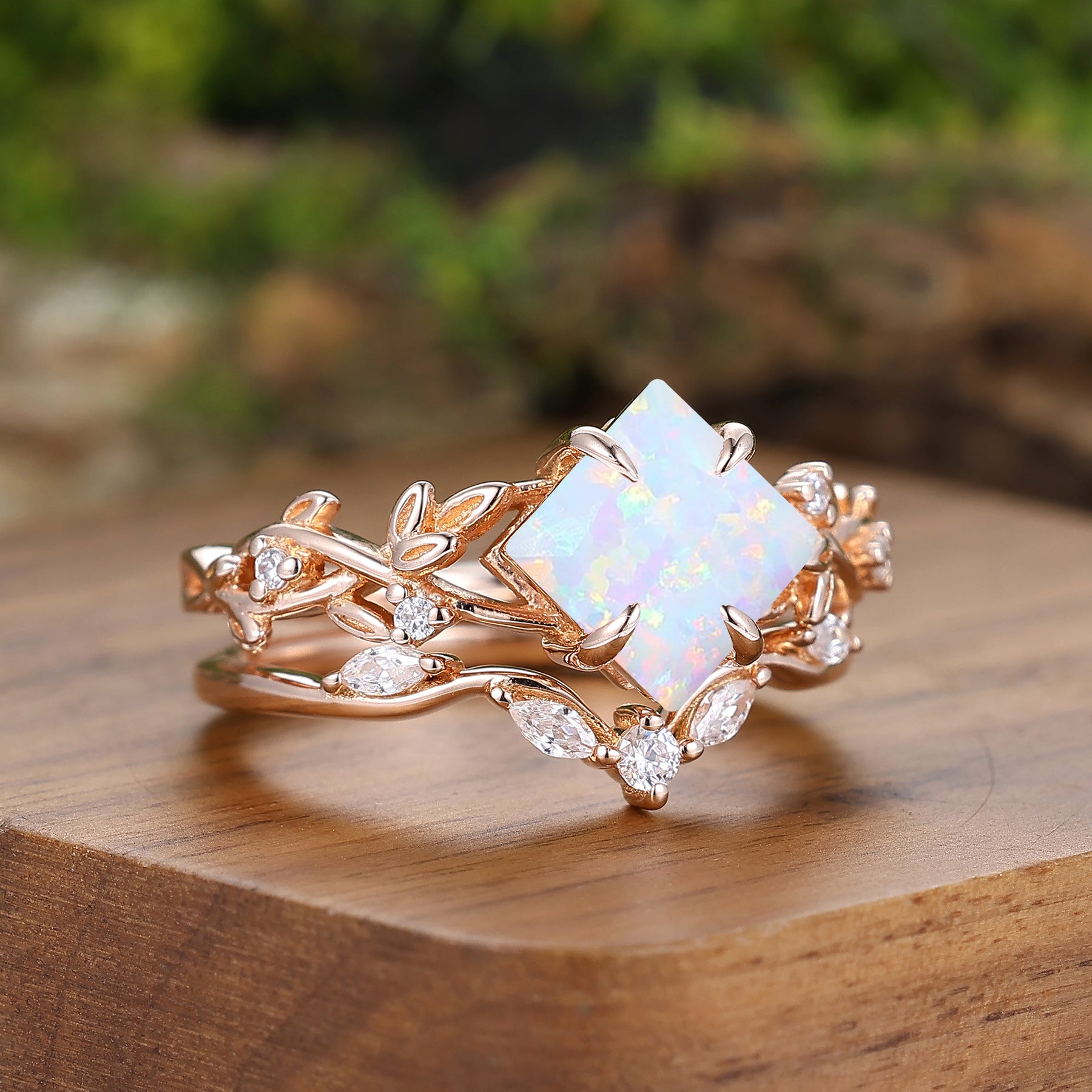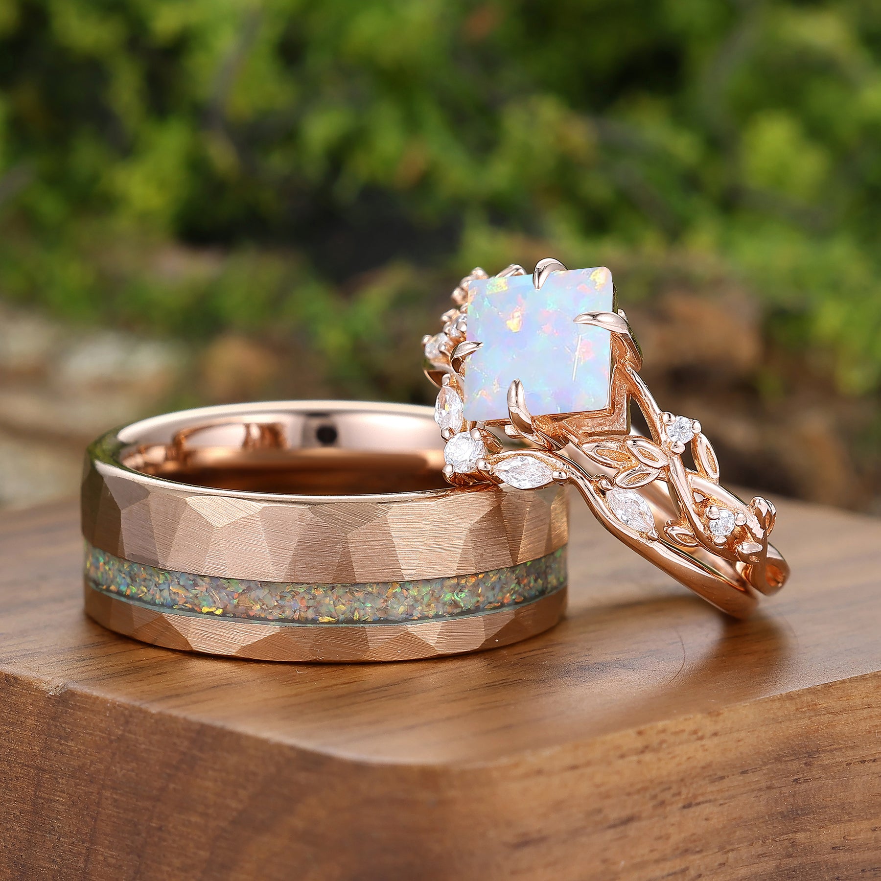Blatt-Inspirierte Rosa-Weiße Opal-Paarringe – Versprechen, Roségold-Beschichtet, Passendes Ring-Set