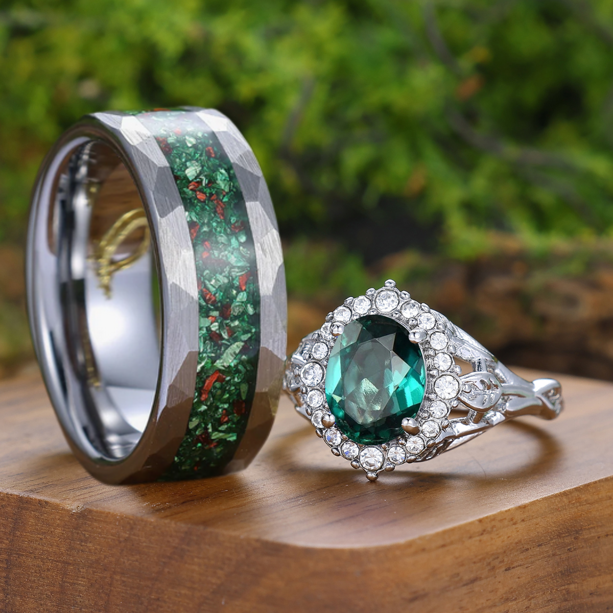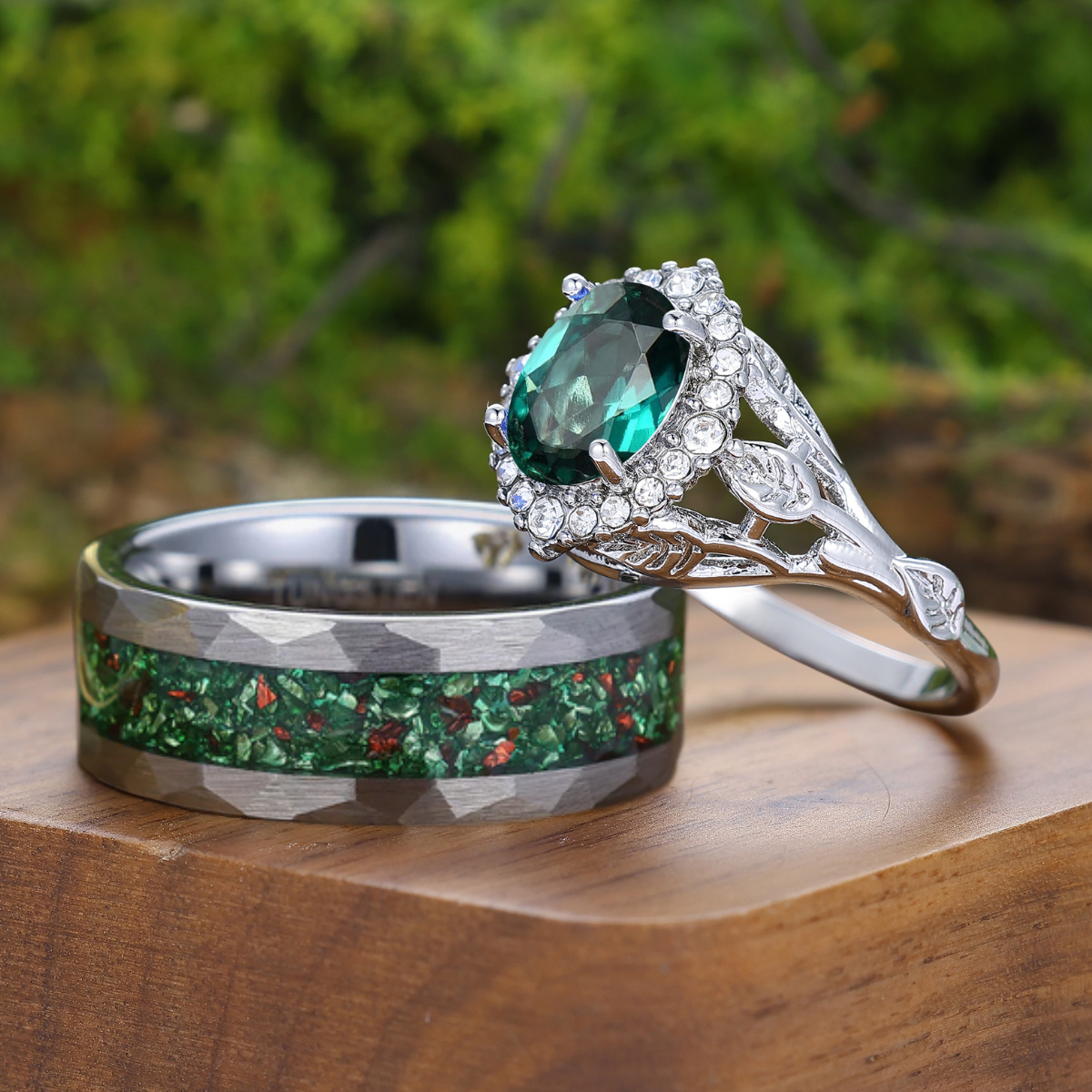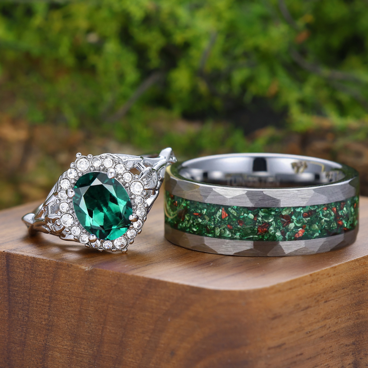 Einzigartige ovale Smaragd-Paarringe – blattinspiriertes Ehering-Set
