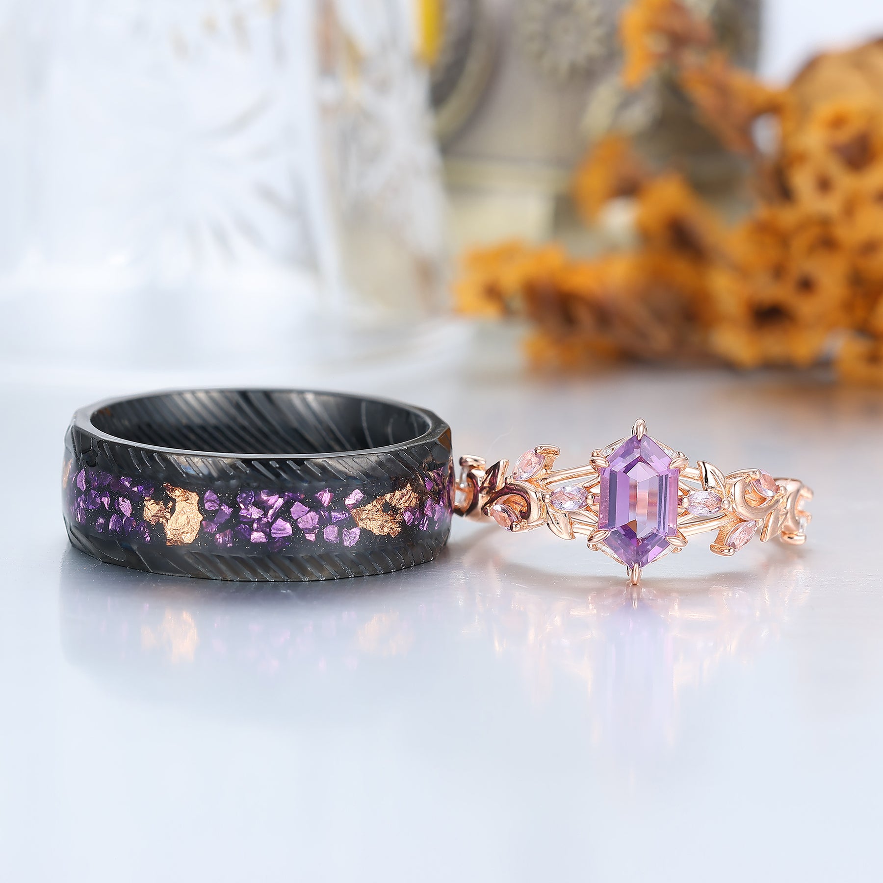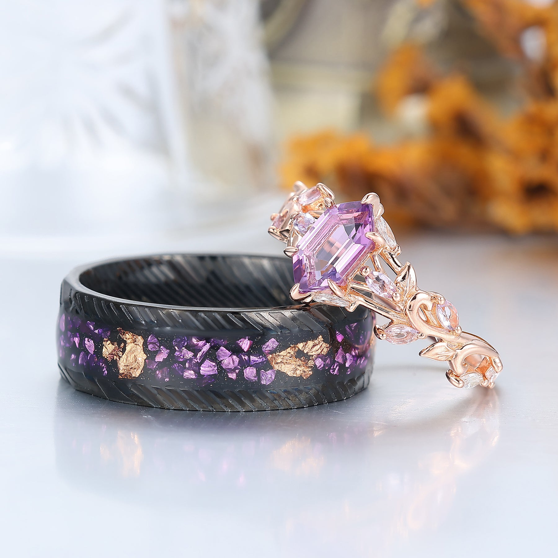 Scrolled Vine Natürliche Amethyst Paar Ringe Lila Passendes Ring Set Sein und Ihr Ring