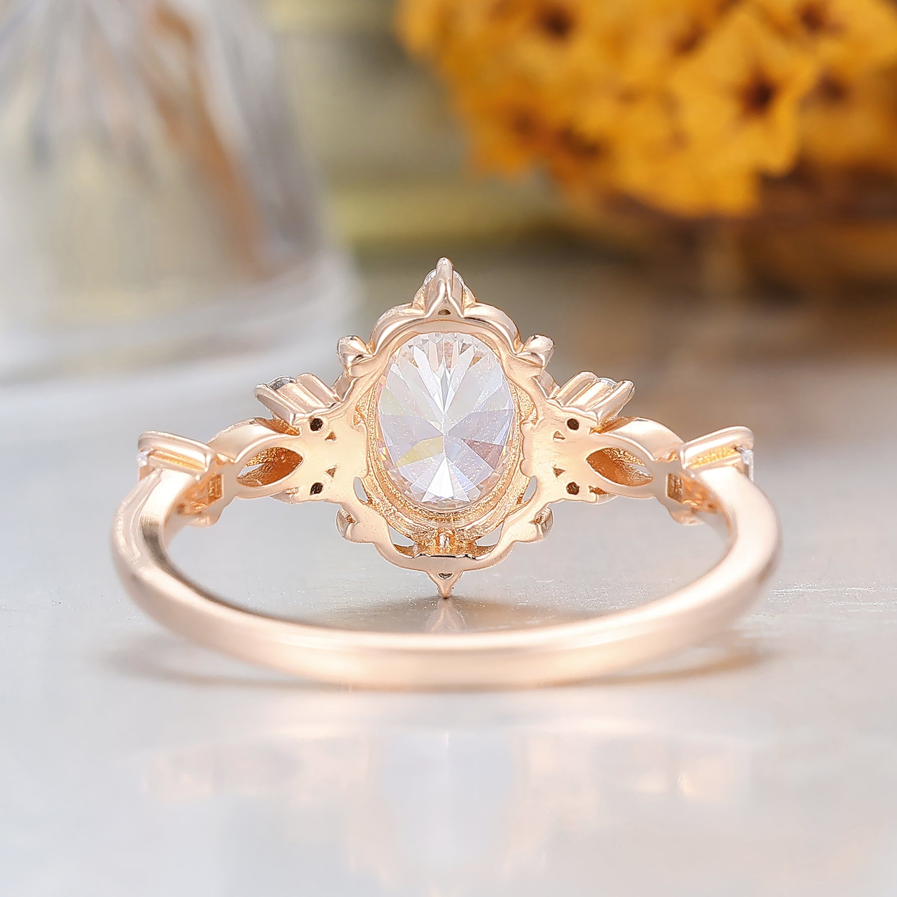 Barockinspirierter ovaler floraler Moissanit-Verlobungsring mit Milgrain, Roségold-Brautring