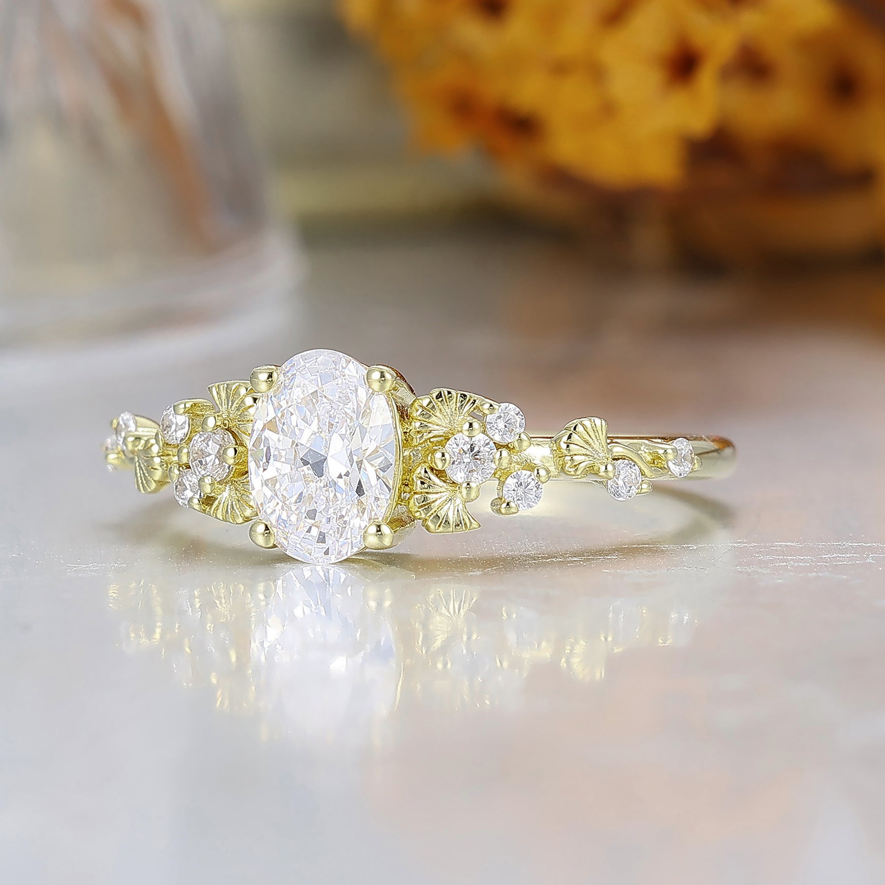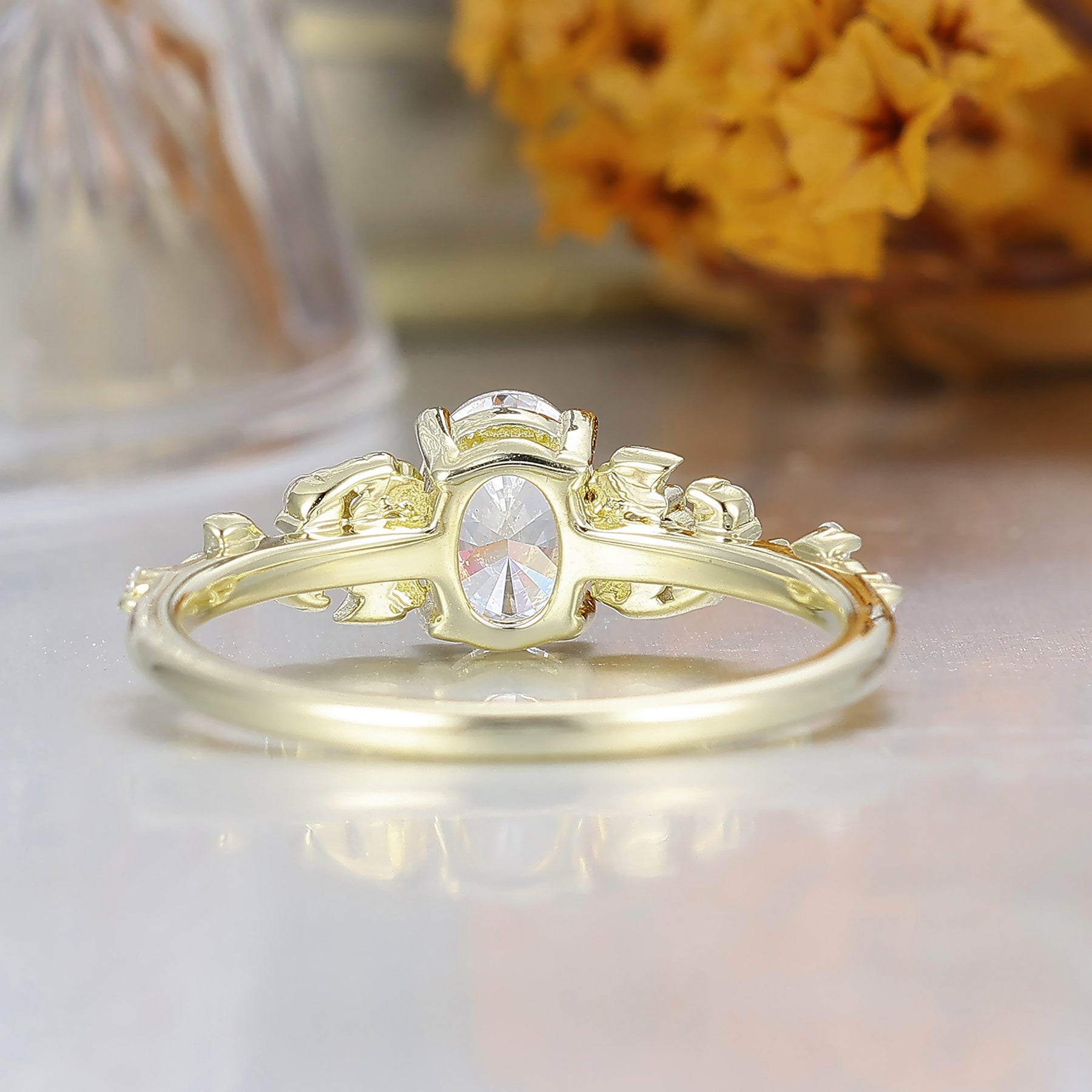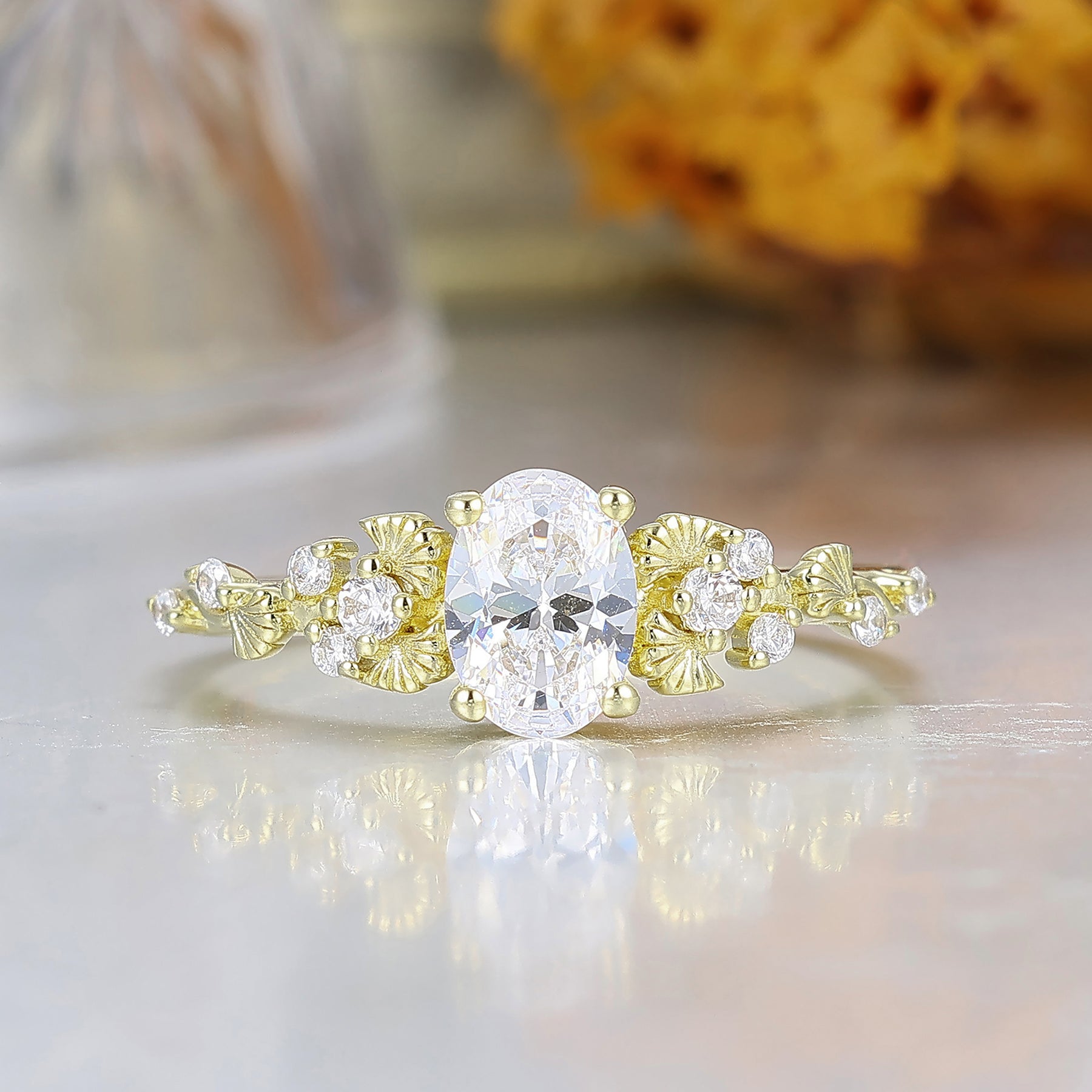 Einzigartiger Ginkgo-Blatt-Ovalschliff-Moissanit-Verlobungsring Handgefertigt Gelbgold Damenring Brautring