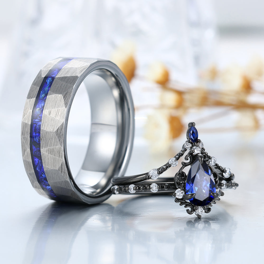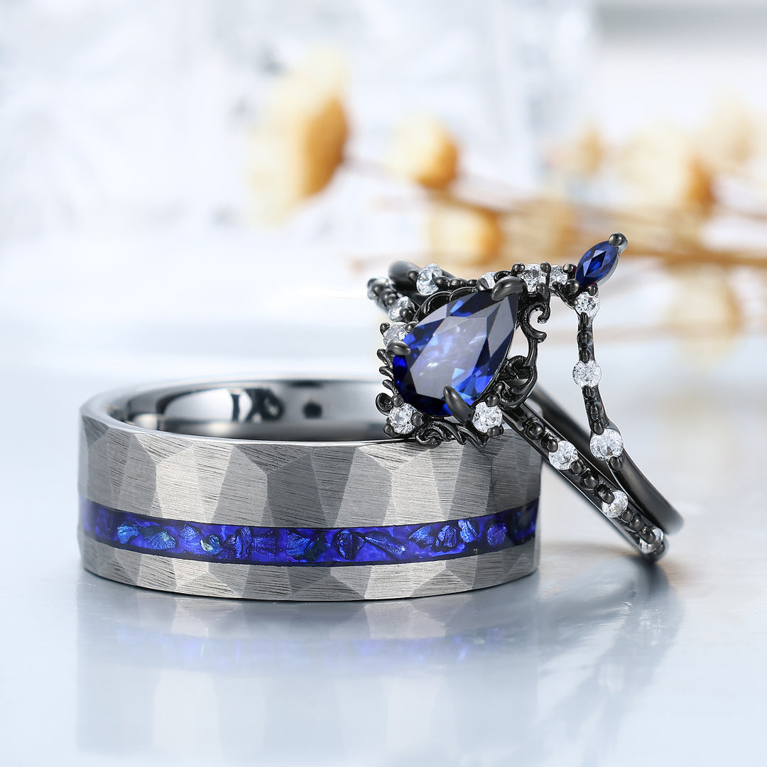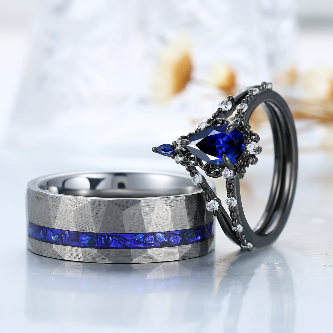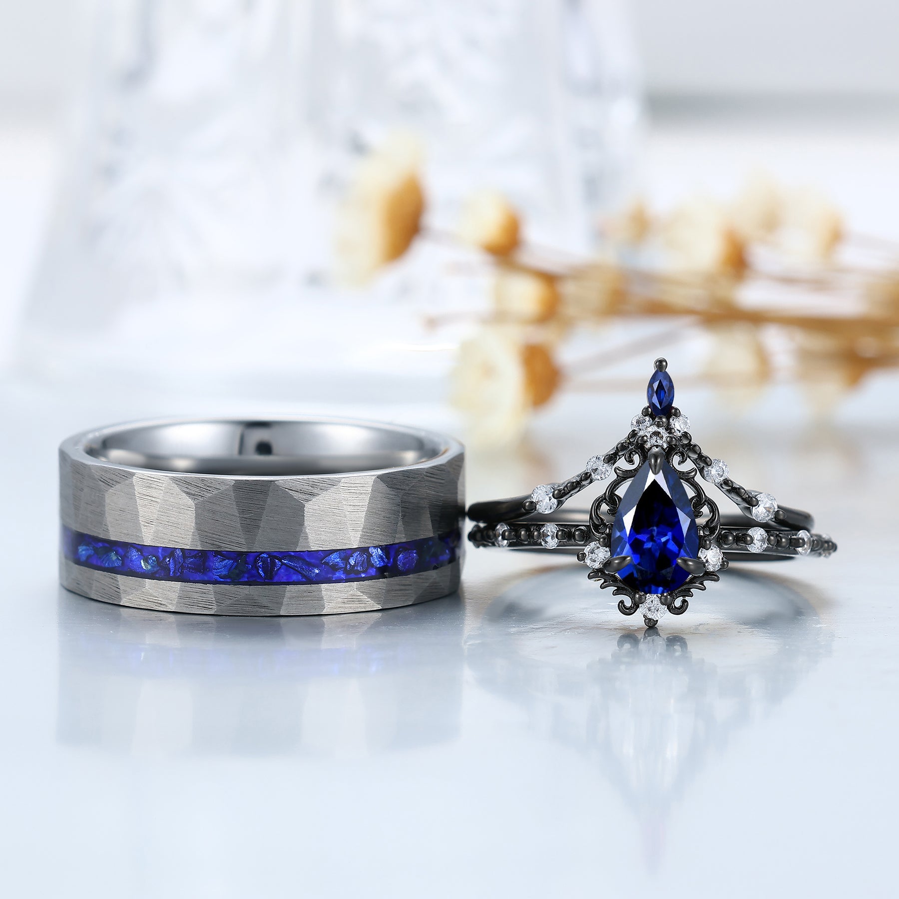 Barock-inspirierte Saphir-filigrane Paar-Ring-Set 3 Stück Blaue Saphir Seine und Ihre passenden Ringe