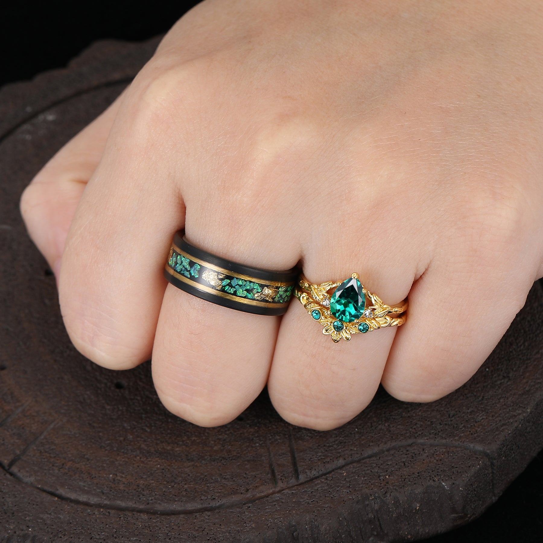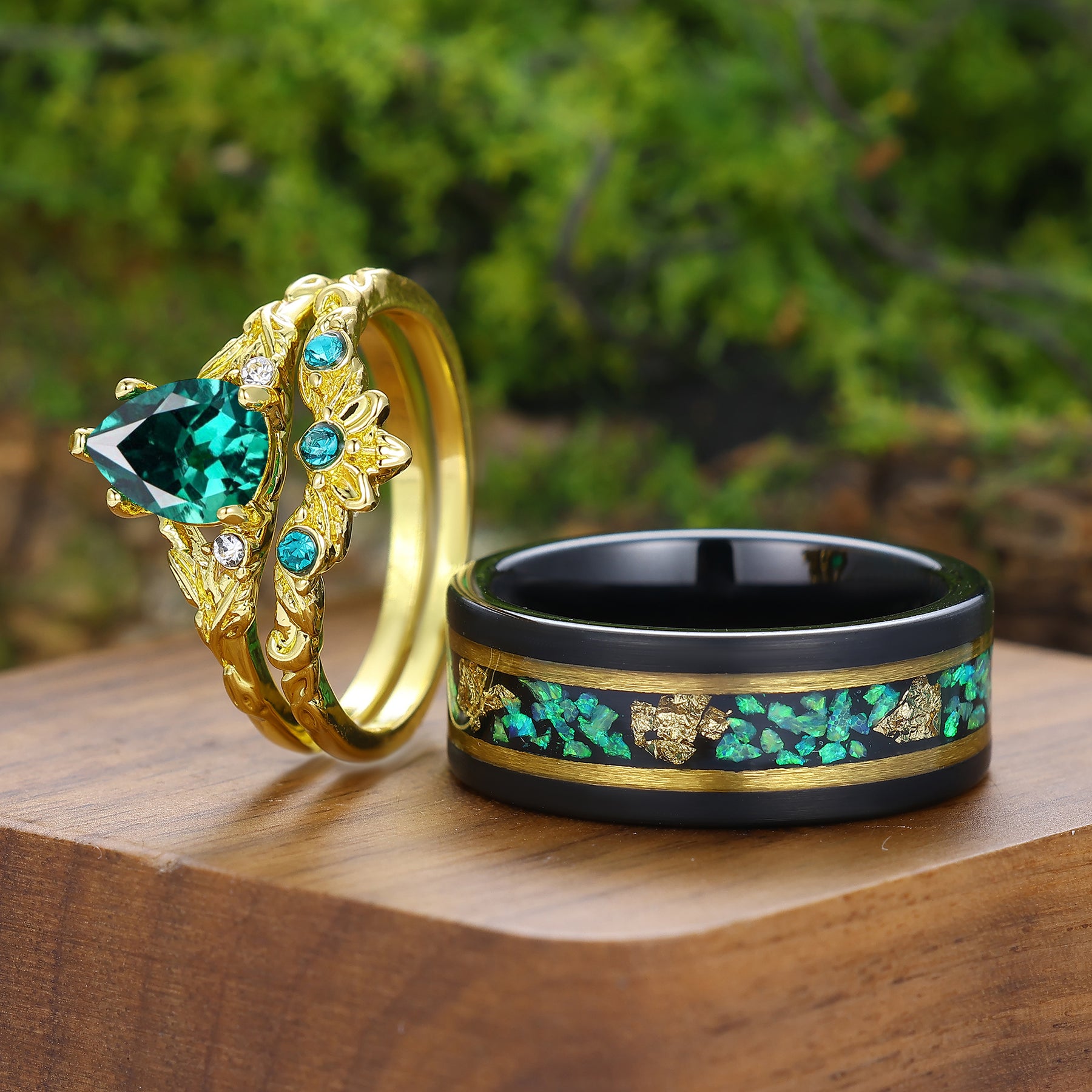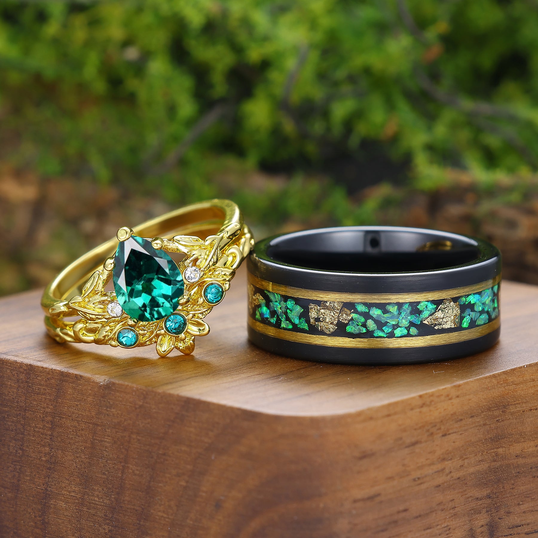 Unique Branch Design Birnenförmige Smaragdblatt Gravierte Partner-Ringe Seine Und Ihre Ringe