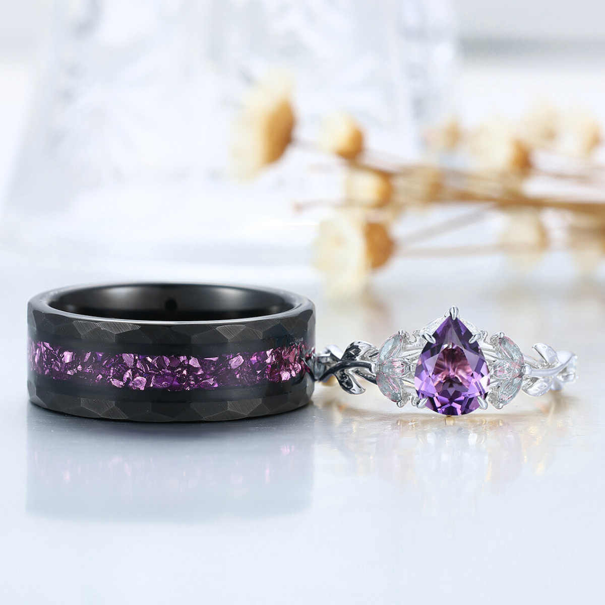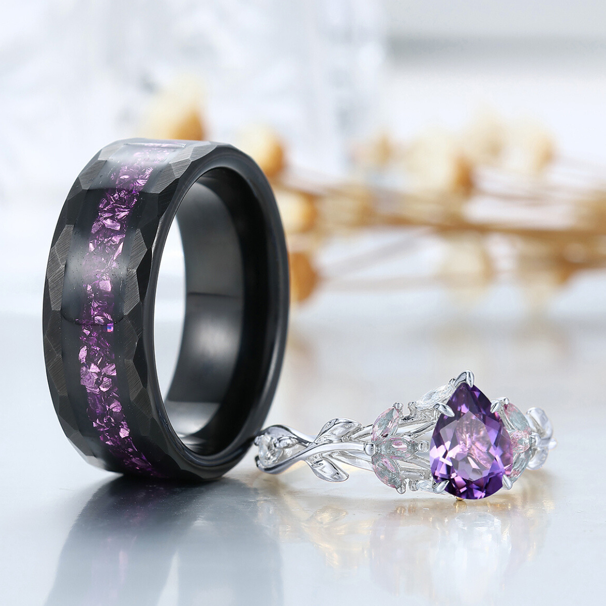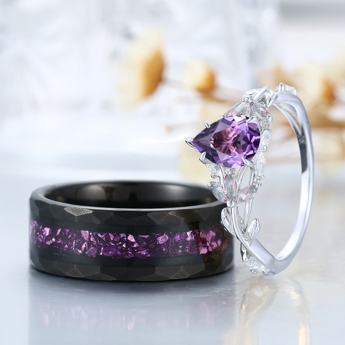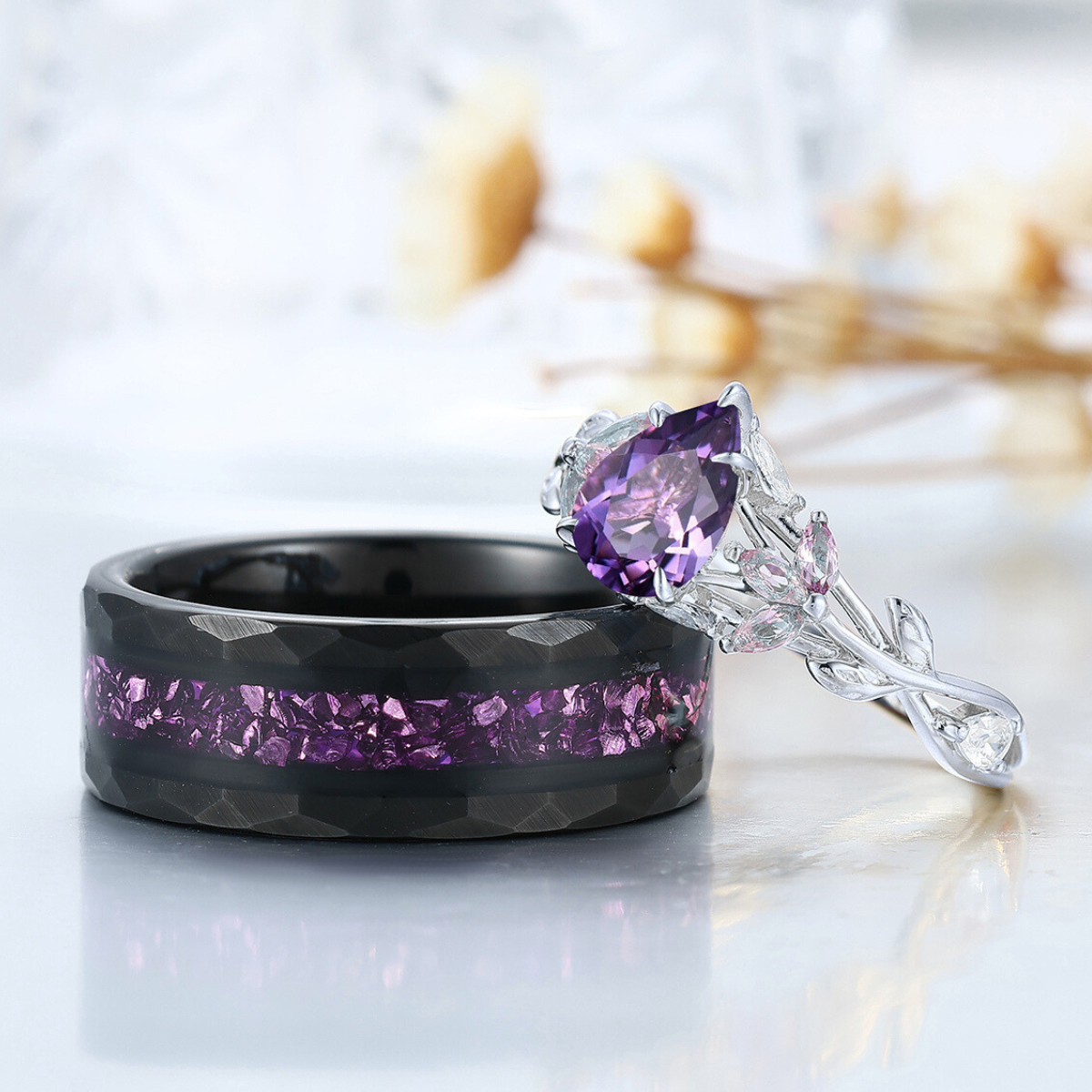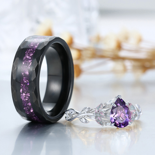 Blattinspiriertes natürliches lila Amethyst-Paarring 2 Stück Ehering für Männer und Frauen