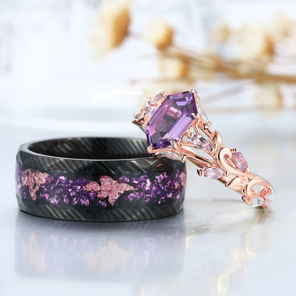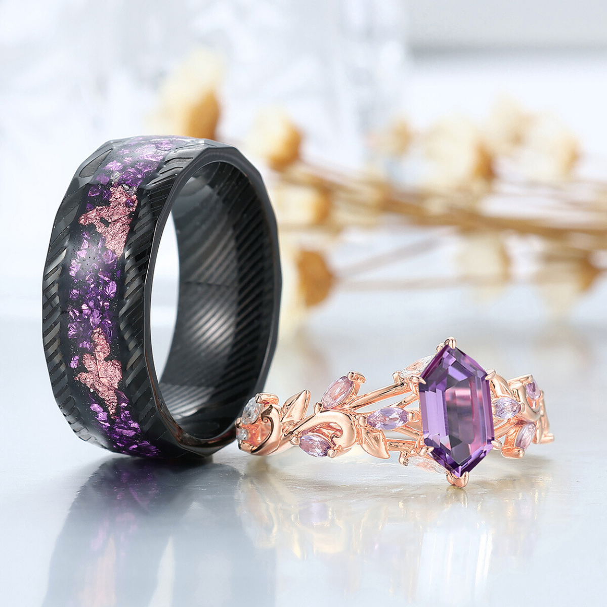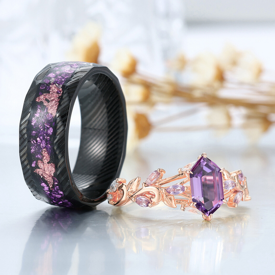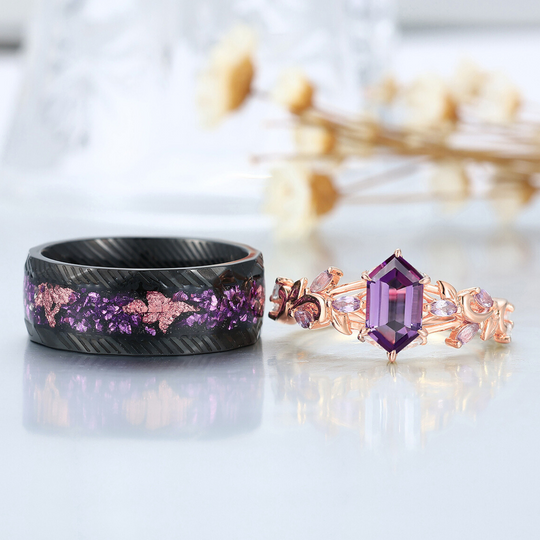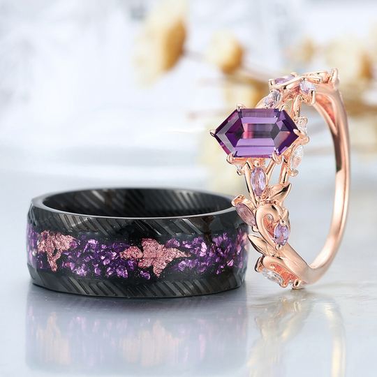 Scrolled Vine Natürliche Amethyst Paar Ringe Lila Passendes Ring Set Sein und Ihr Ring