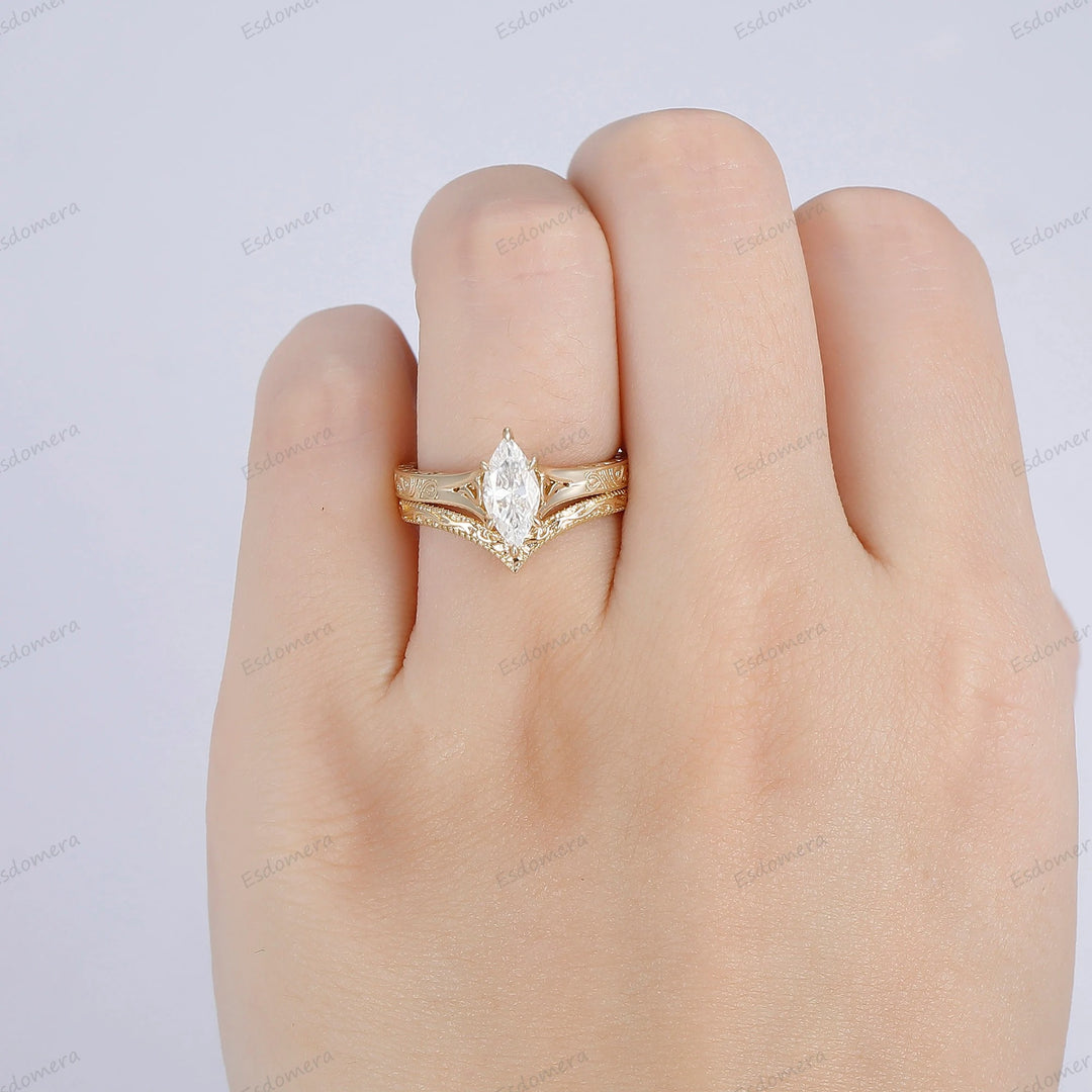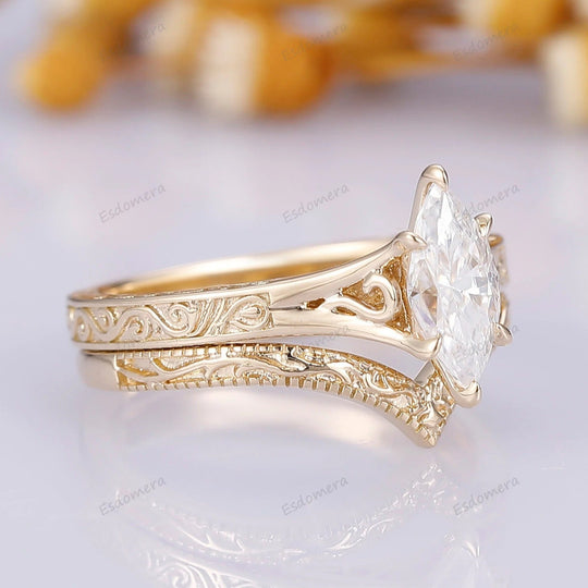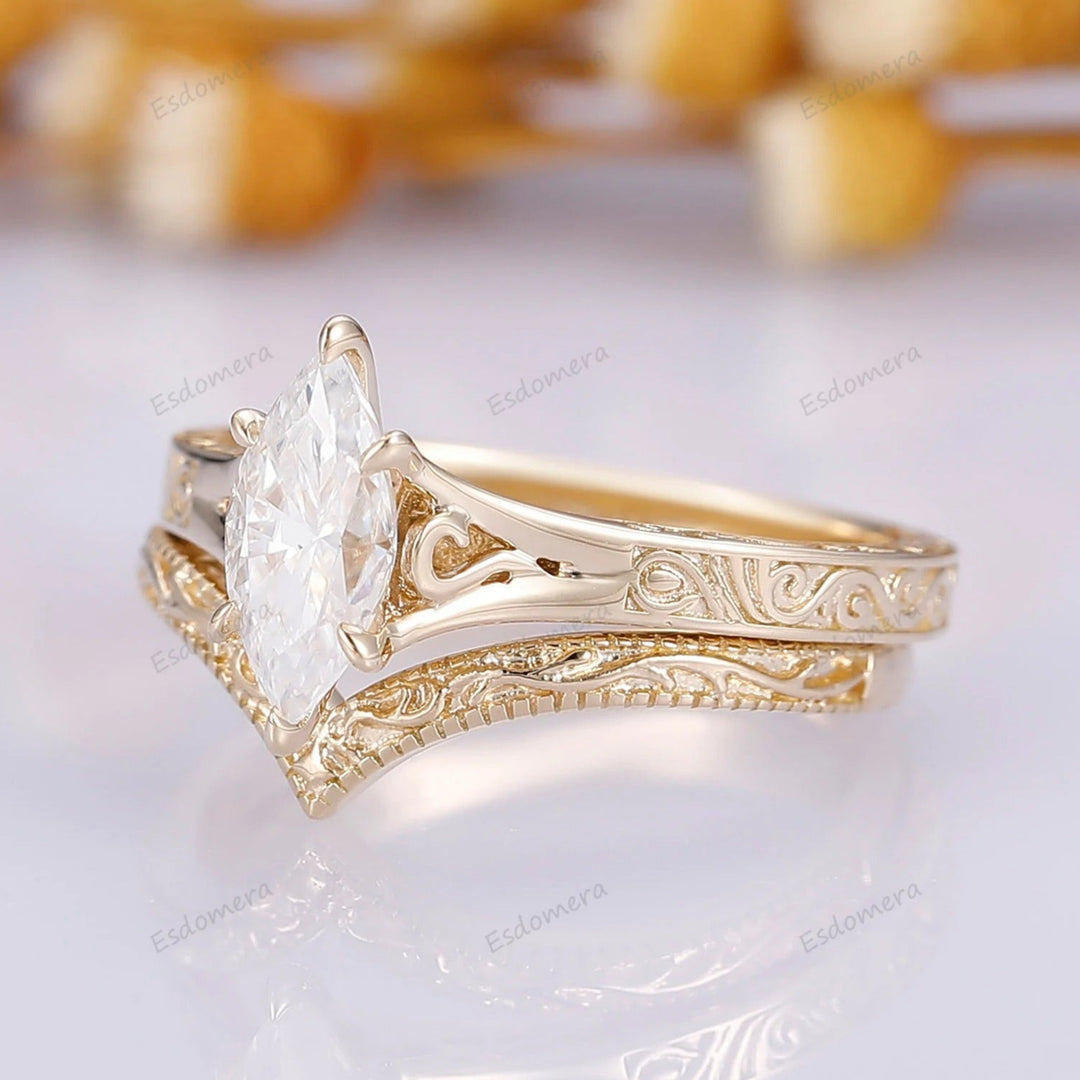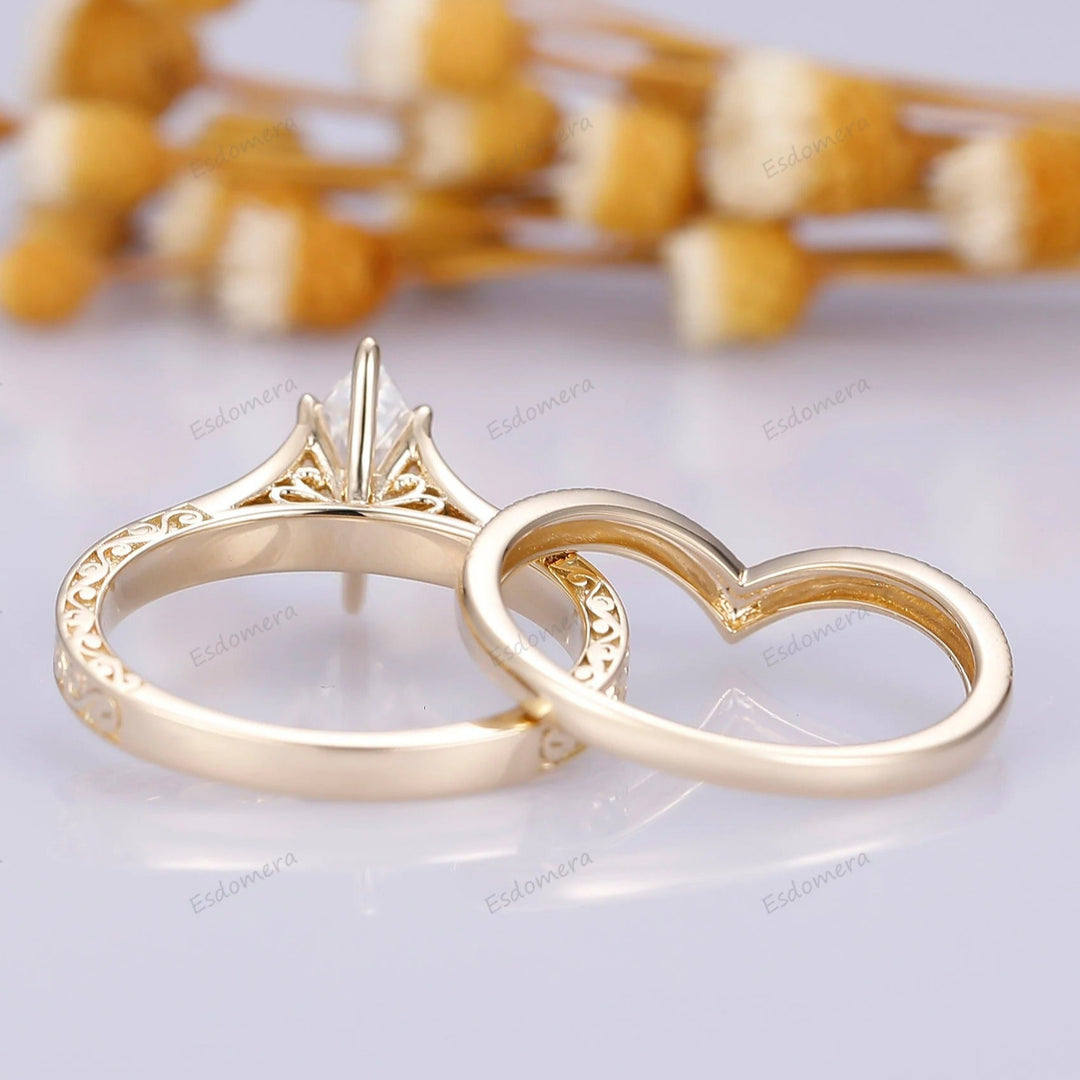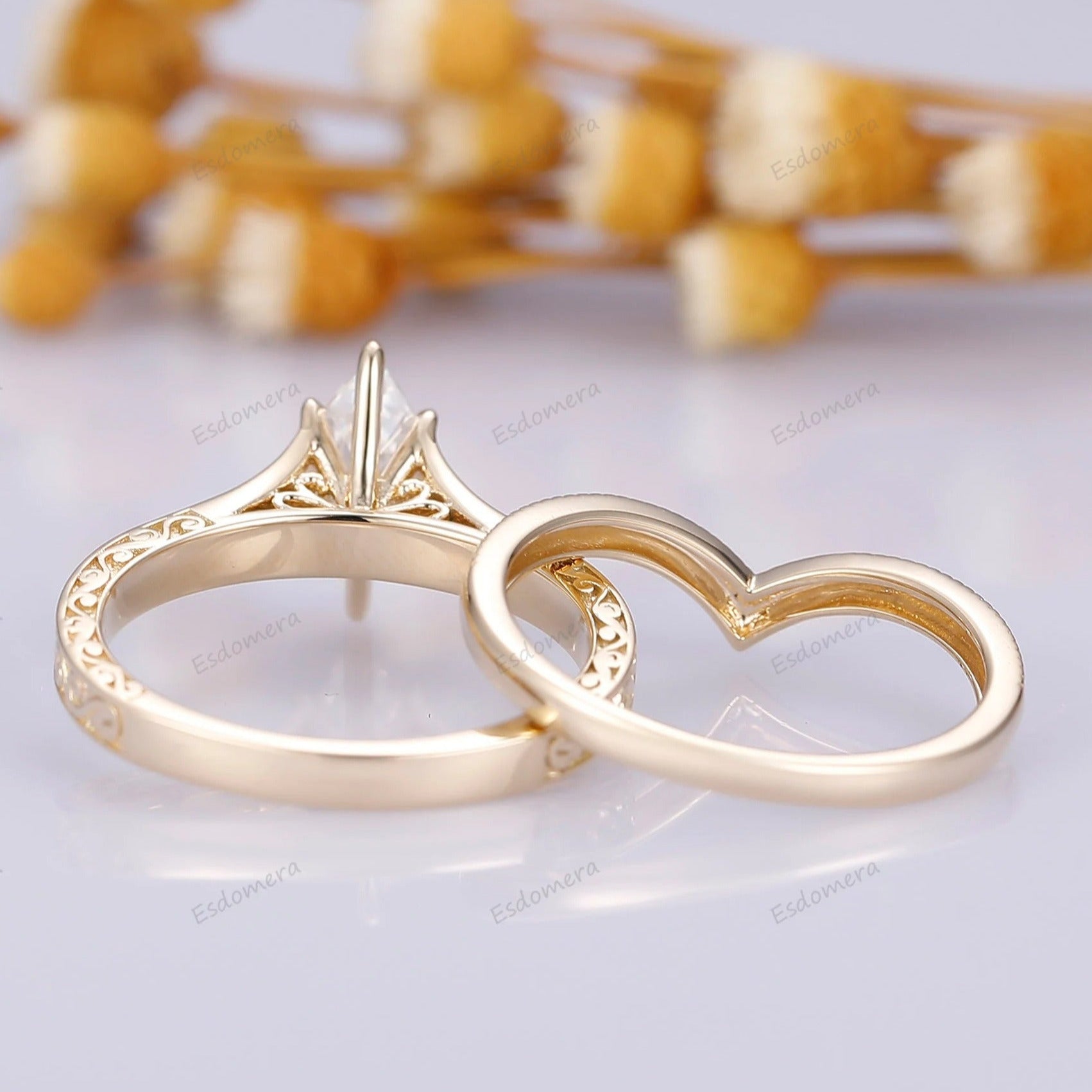 Solide Gelbgold Filigrane Flache Flügel Marquise Schliff Moissanit Ehering Set 2 Stück Verlobungsring Set