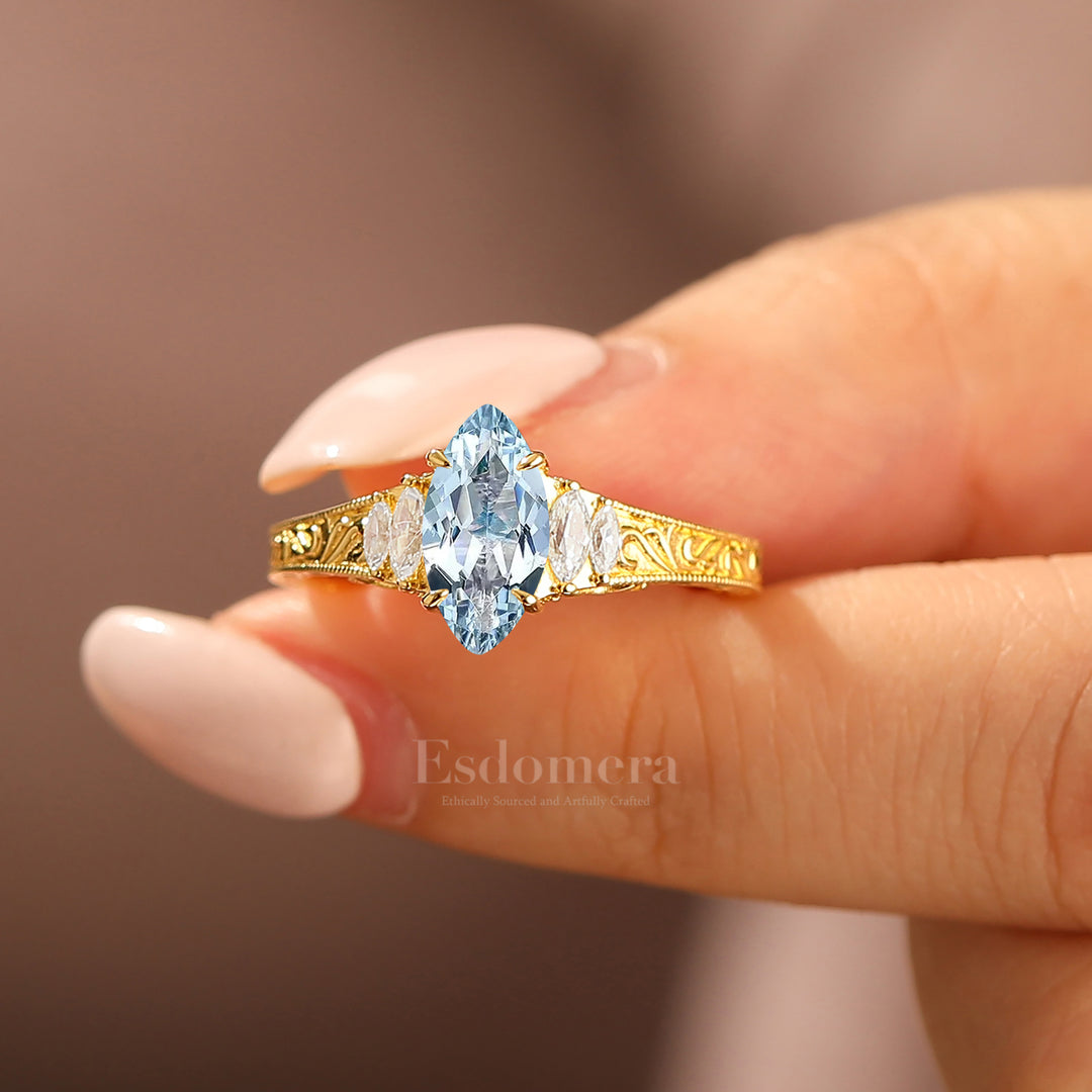 Descubre la serena belleza de los anillos de compromiso con aguamarina en Esdomera. Conocida como la "gema del mar", los tonos azules tranquilos de la aguamarina simbolizan el amor eterno y aguas calmadas por delante. Nuestra colección presenta gemas naturales de aguamarina en diseños inspirados en lo vintage y contemporáneos, perfectos para cumpleaños de marzo o para quienes se sienten atraídos por la hipnotizante belleza del océano.
