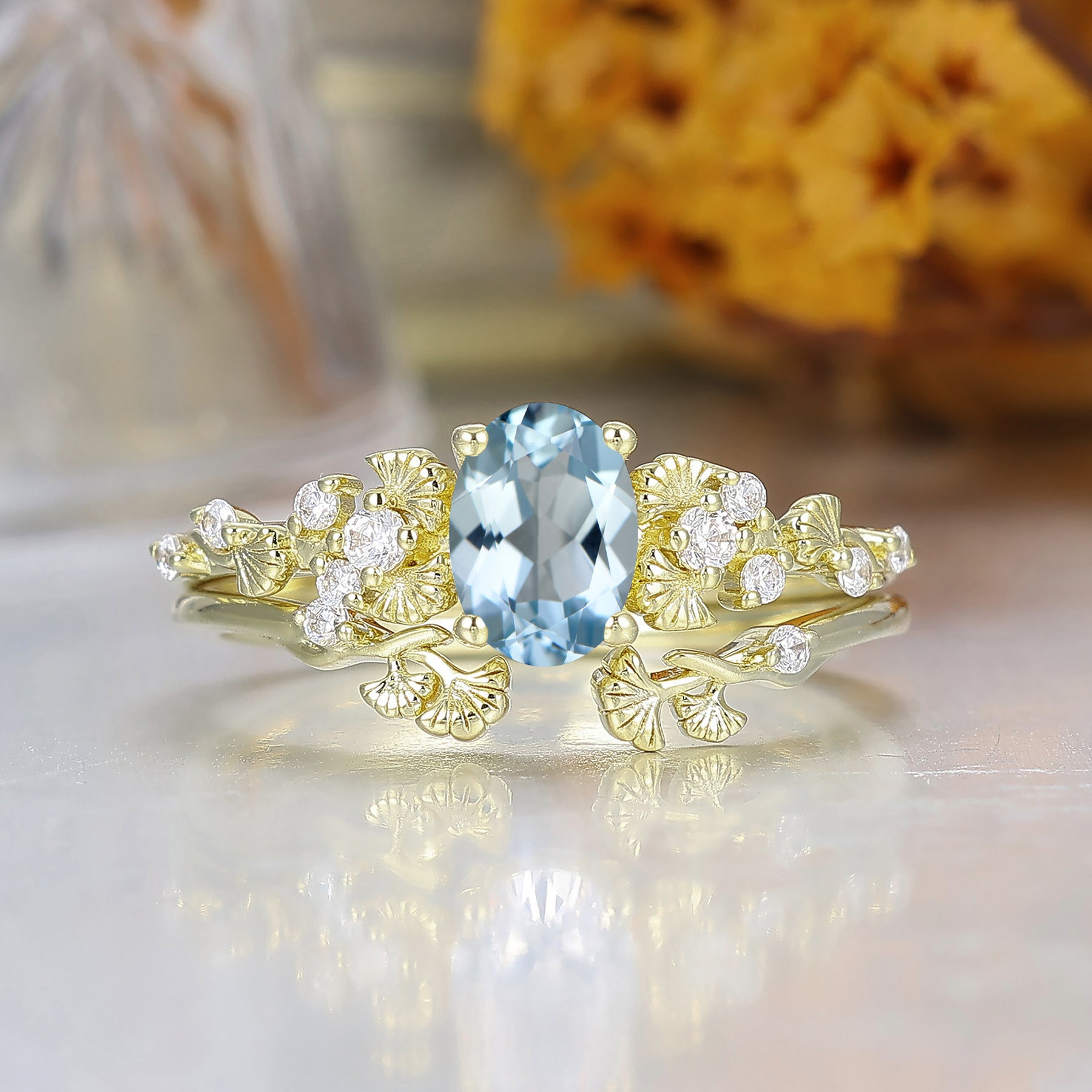 Ginkgo Hoja Oval Corte Aguamarina Anillo de Compromiso Conjunto 14K Oro Macizo Piedra de Nacimiento de Marzo Anillo para Mujer