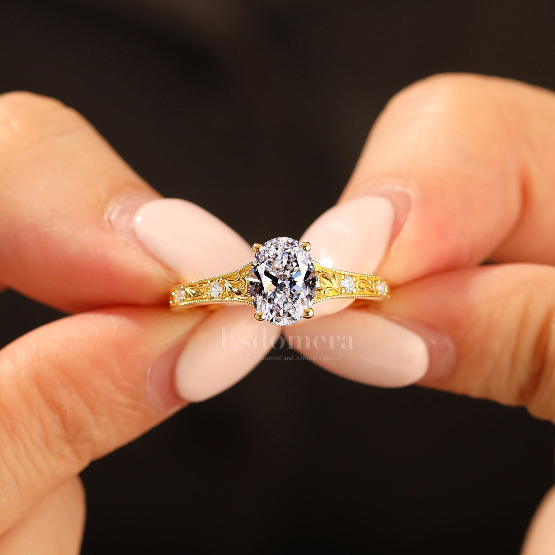 14K Oro Amarillo Anillo de Banda Ovalado con Diamante Cultivado en Laboratorio Cu Filigrana Anillo de Compromiso (Certificado IGI)
