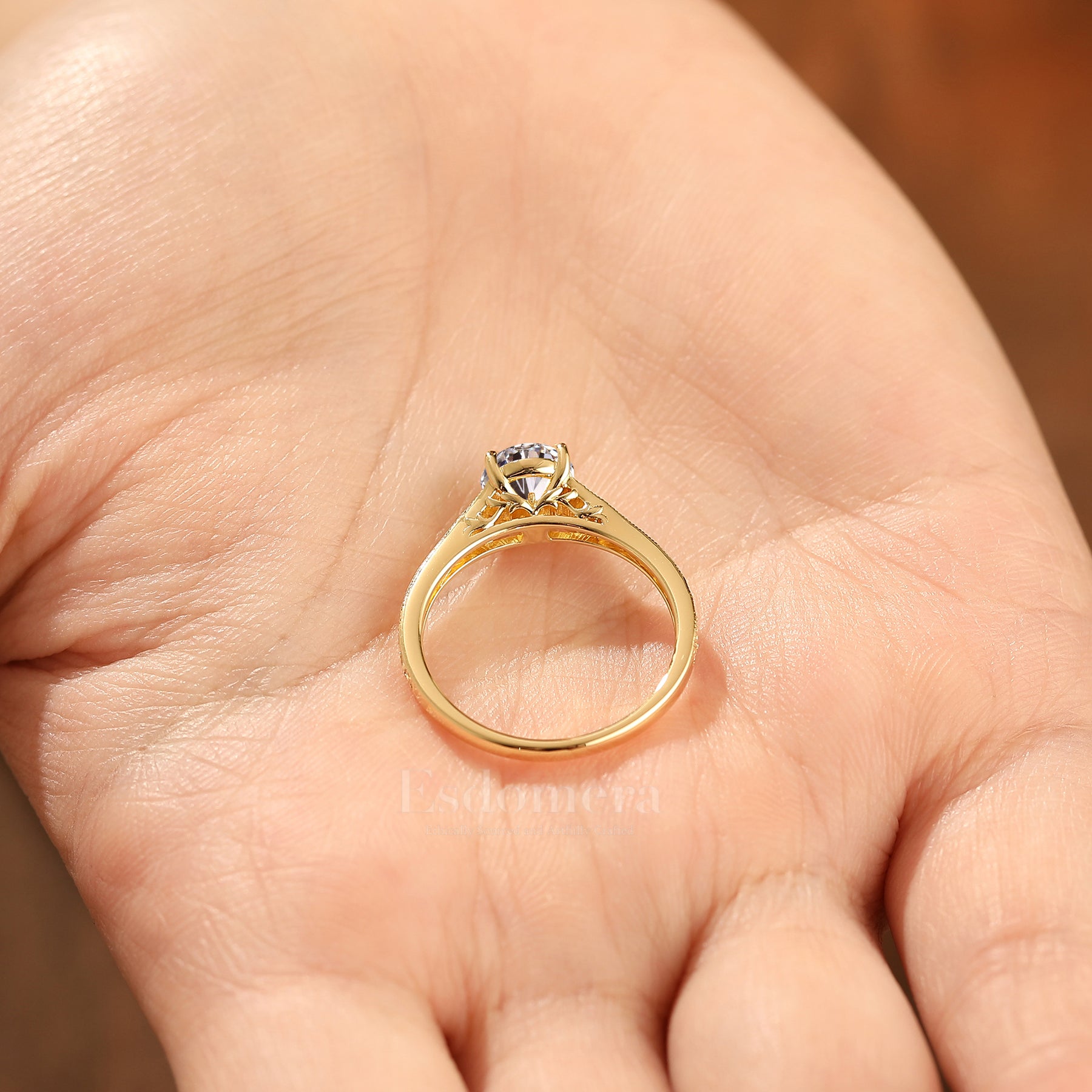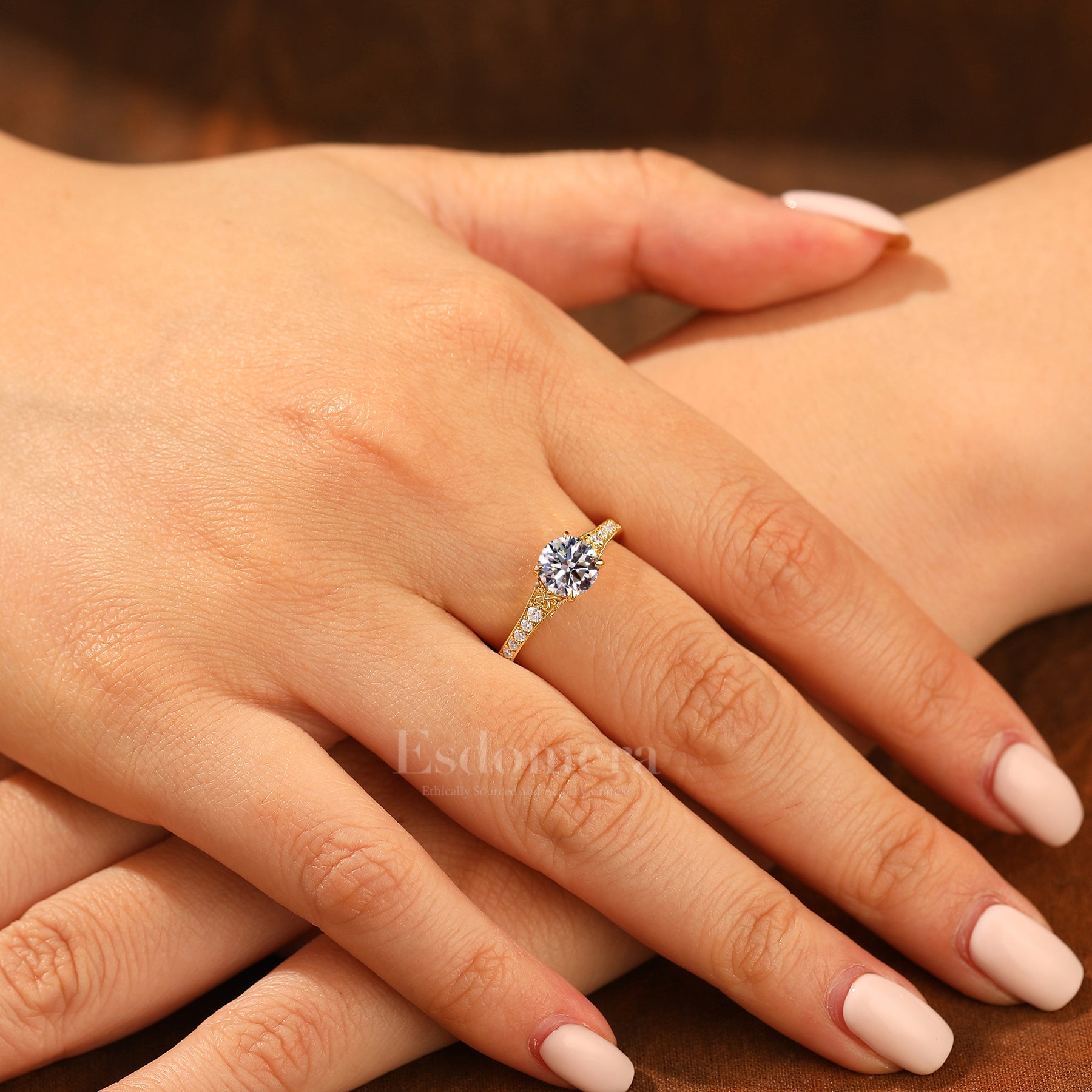Anillo redondo de diamante cultivado en laboratorio de oro 14K con piedras laterales engastadas en canal (certificado por IGI)