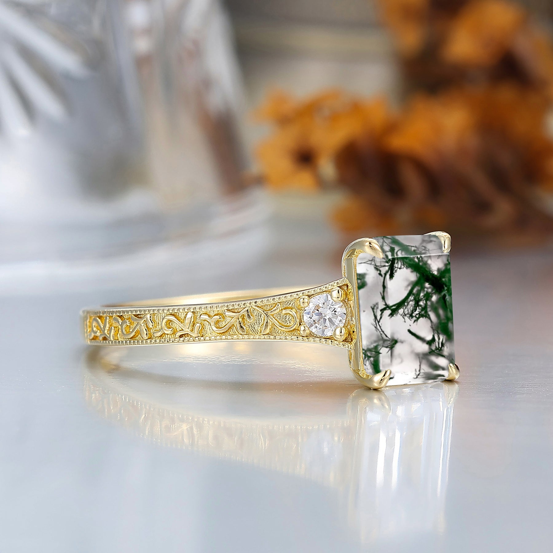 2CT Anillo Nupcial de Ágata Musgosa Corte Esmeralda Banda de Oro Amarillo Anillo de Boda Floral Grabado para Mujer