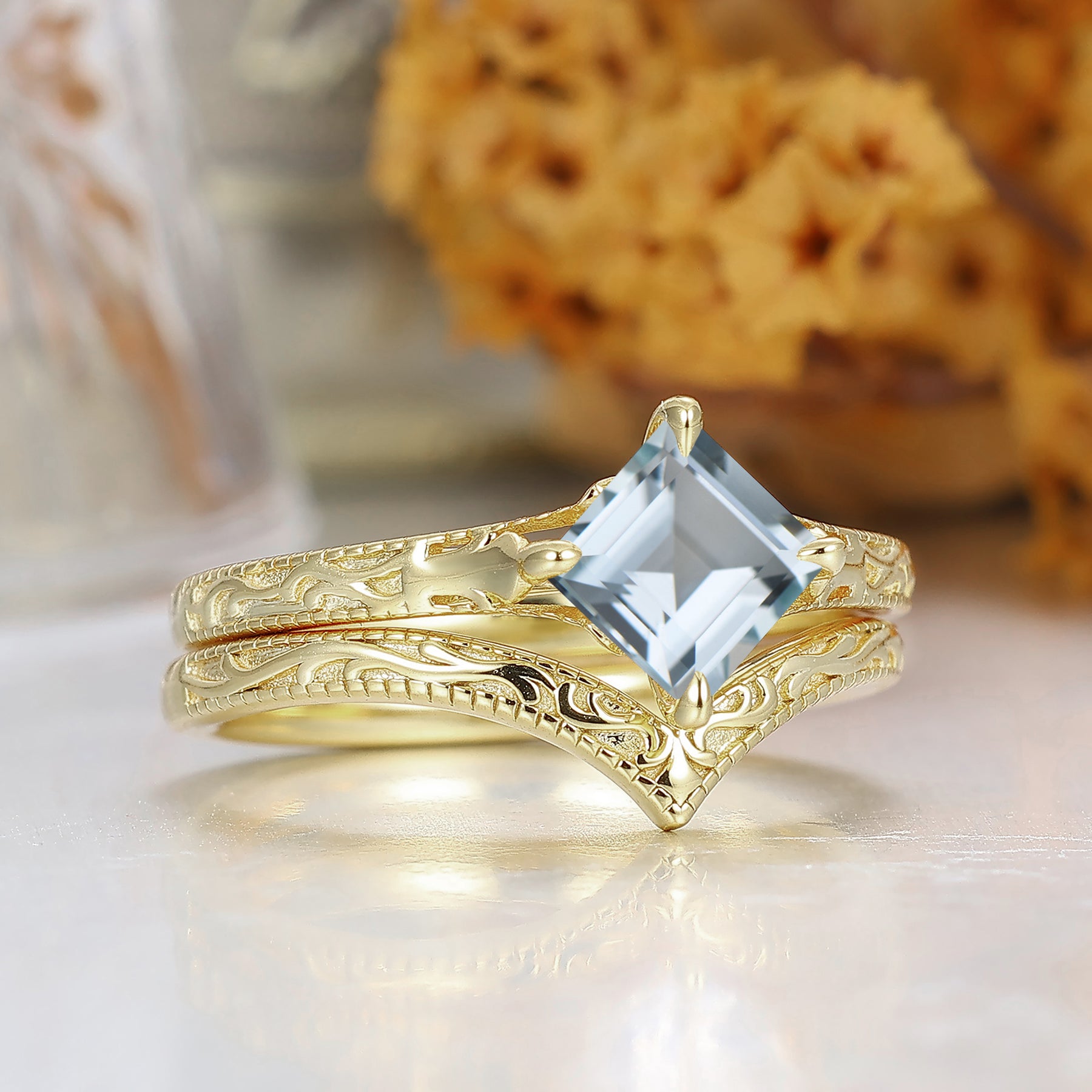 Square Cut Solitaire Aigue-marine Bague de Mariage Filigrane Ensemble Fait Main Bague de Mariée en Or Jaune 14K