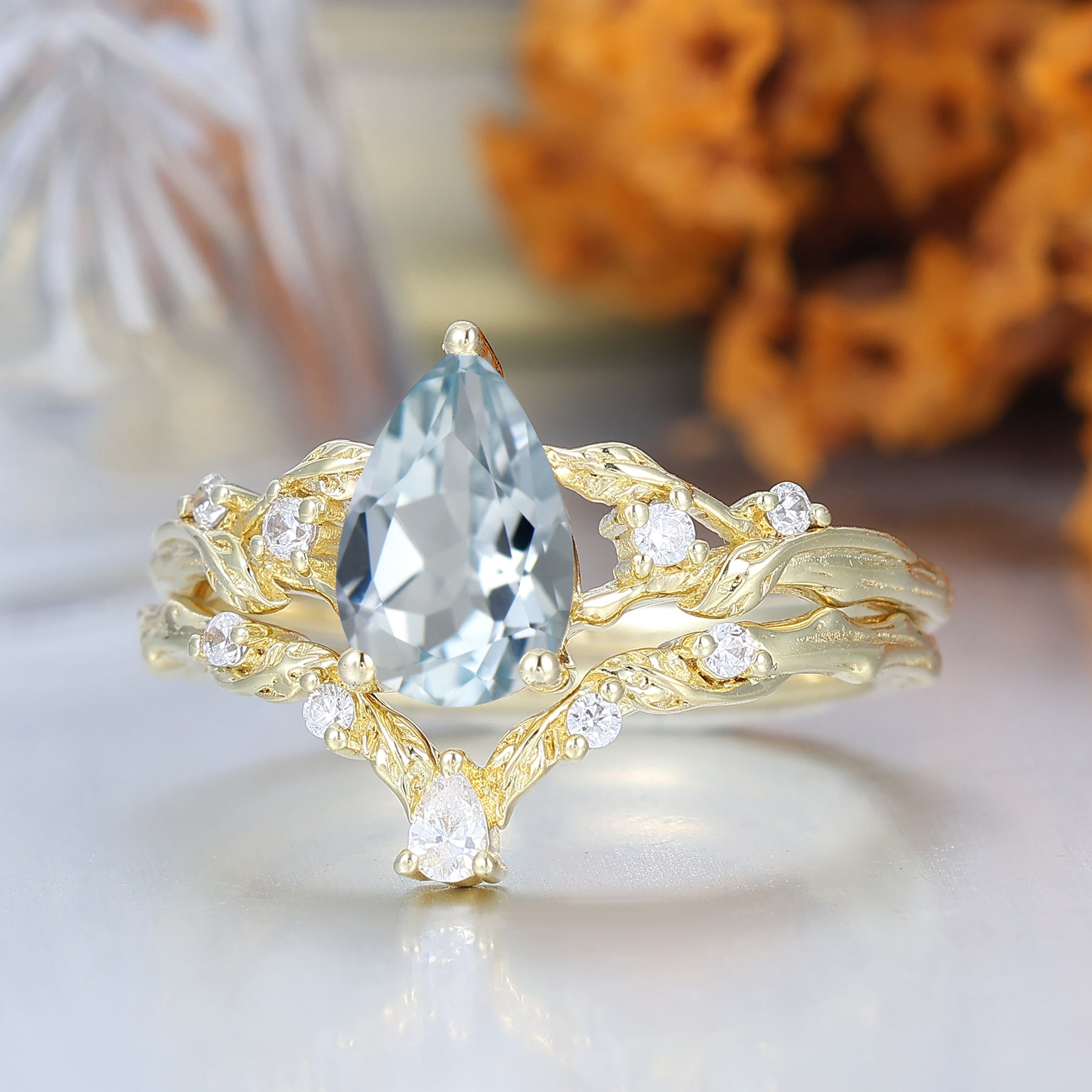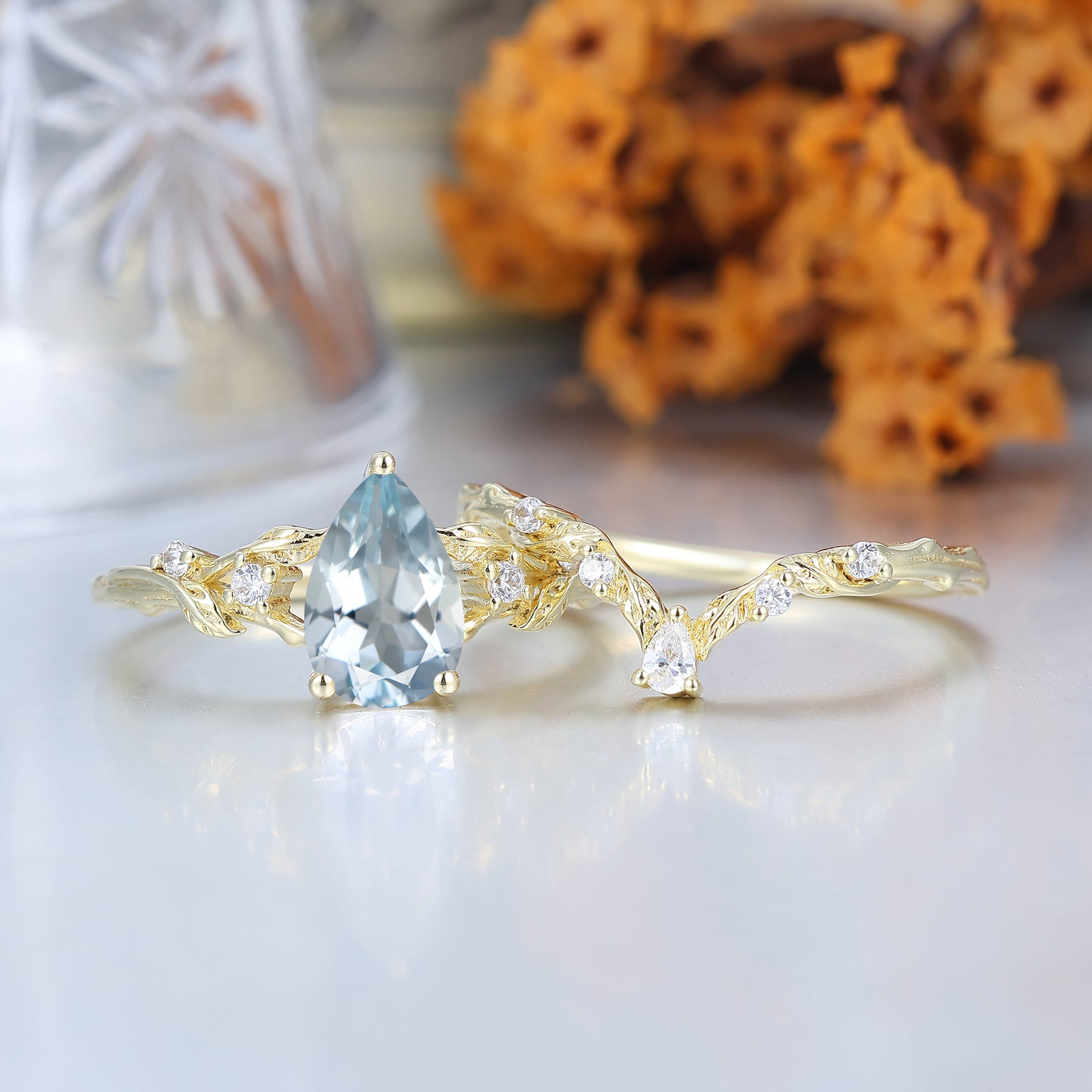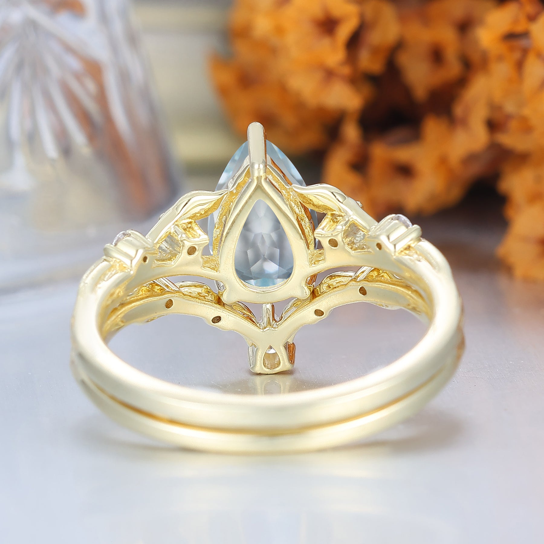 Ensemble de bagues de mariage en aigue-marine taille poire d'inspiration naturelle 2 pièces en or massif Bagues pour femmes en aigue-marine