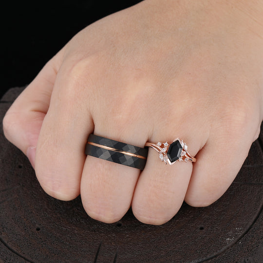 Ensemble exquis de bagues de fiançailles en agate noire naturelle, bagues assorties pour couple, élégantes bagues de mariage en tungstène martelé pour lui et pour elle