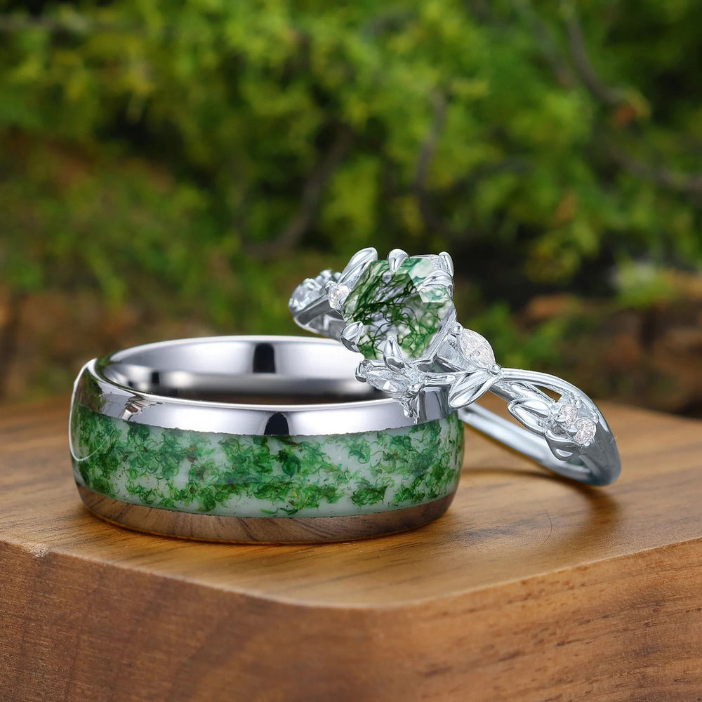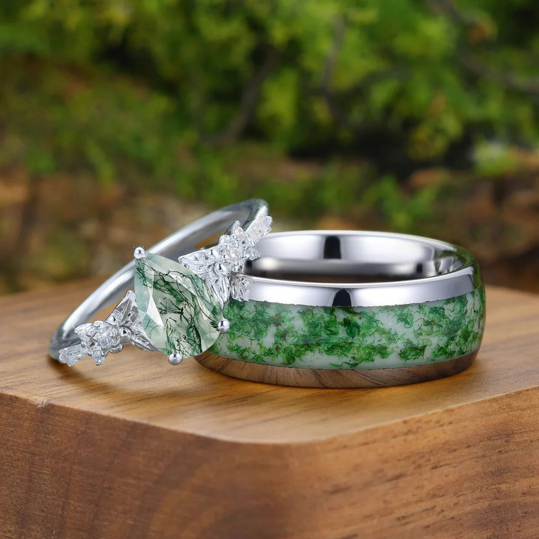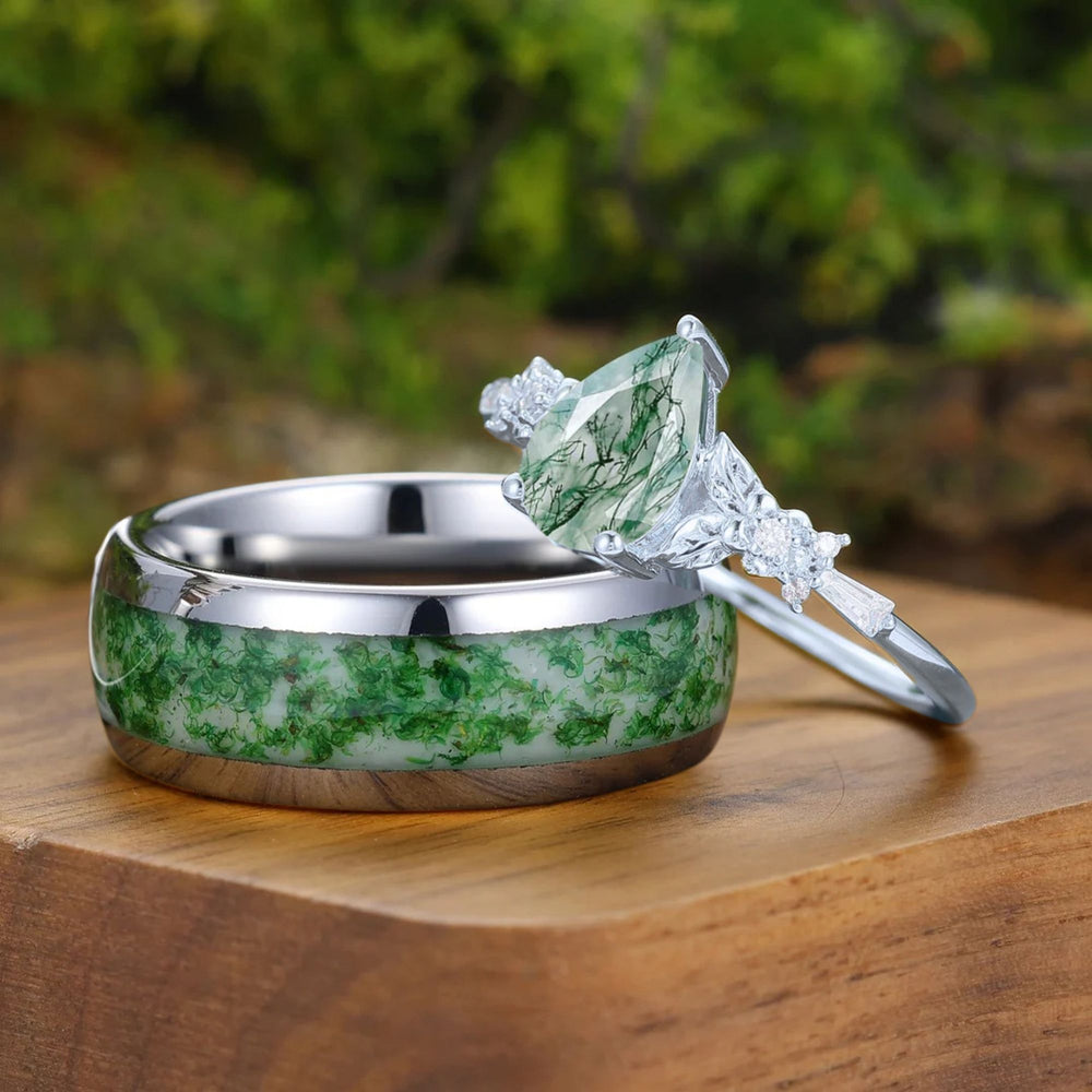 - Ensembles de bagues de mariage en agate mousse : Ces ensembles sont spécialement conçus pour votre jour de mariage, comprenant souvent un magnifique ensemble de mariée (une bague de fiançailles et une alliance assortie) ainsi qu'une alliance coordonnée pour le marié.