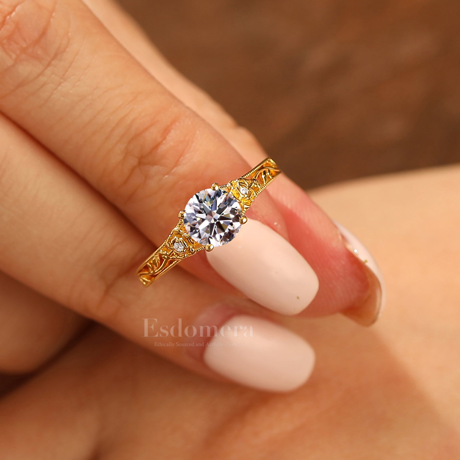 14K Bague de fiançailles en or jaune avec diamant synthétique, filigrane complexe, gravure florale pour femme (certifiée IGI)