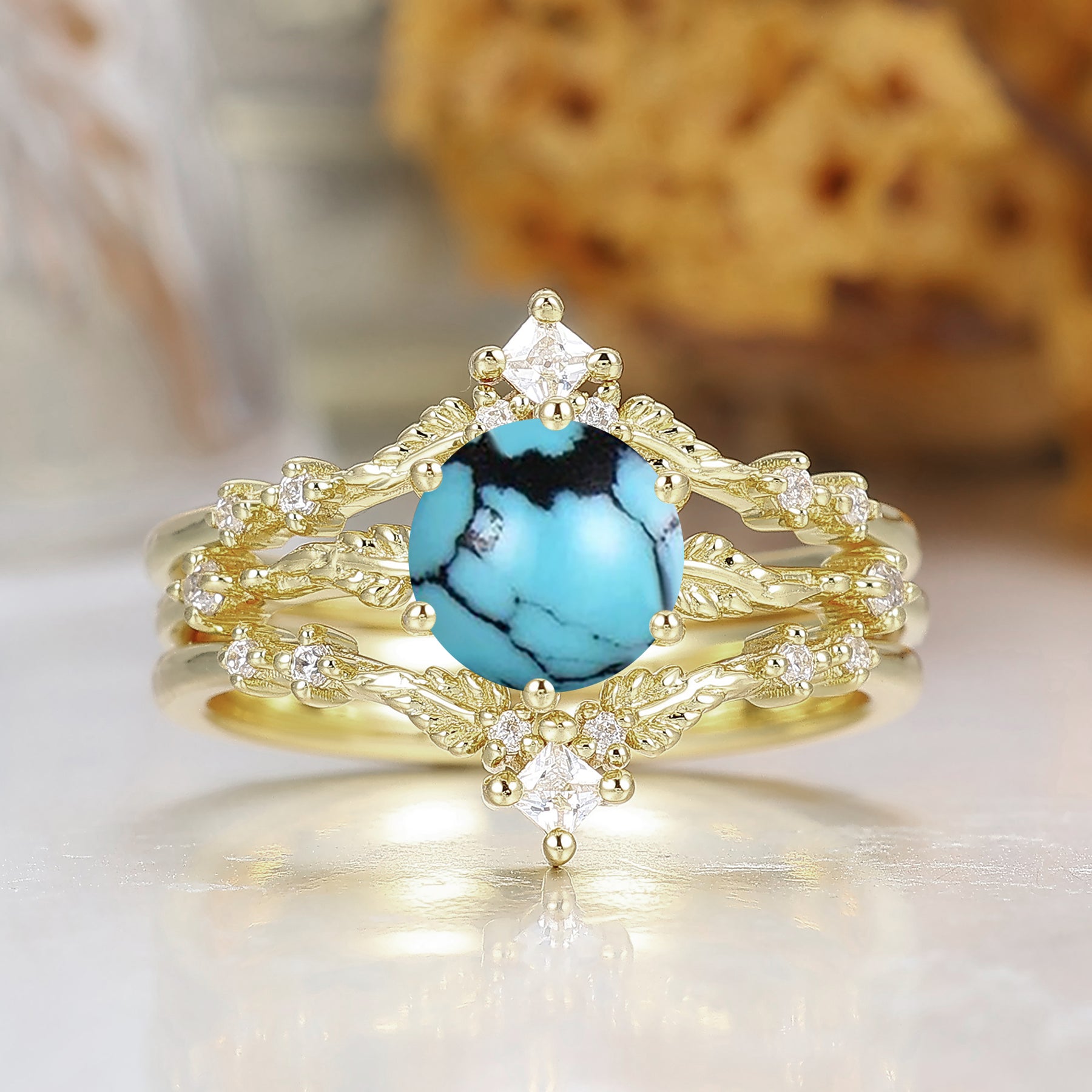 Dainty Leaf Design Turquoise Bridal Anniversary Ring Set Antique Ring For Women