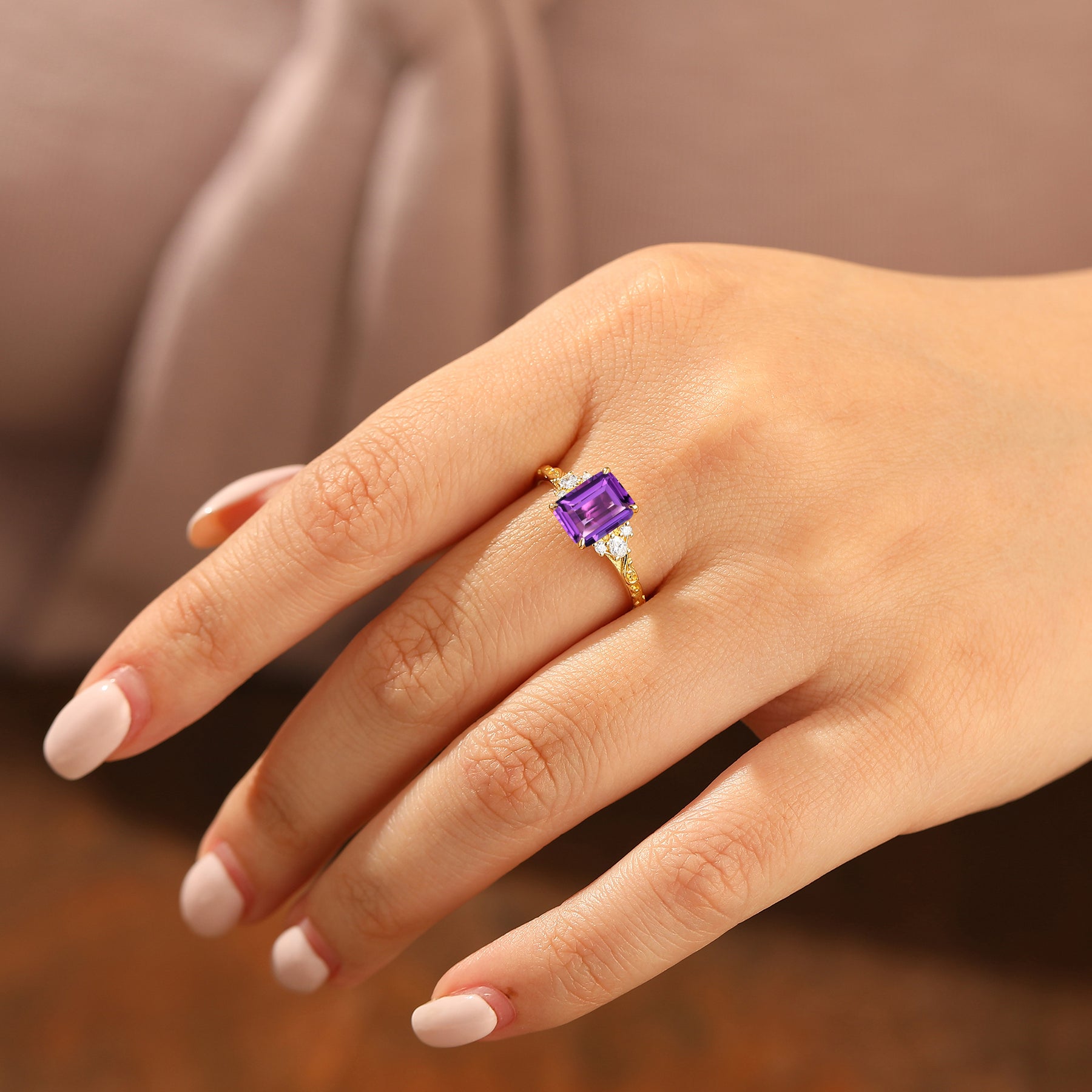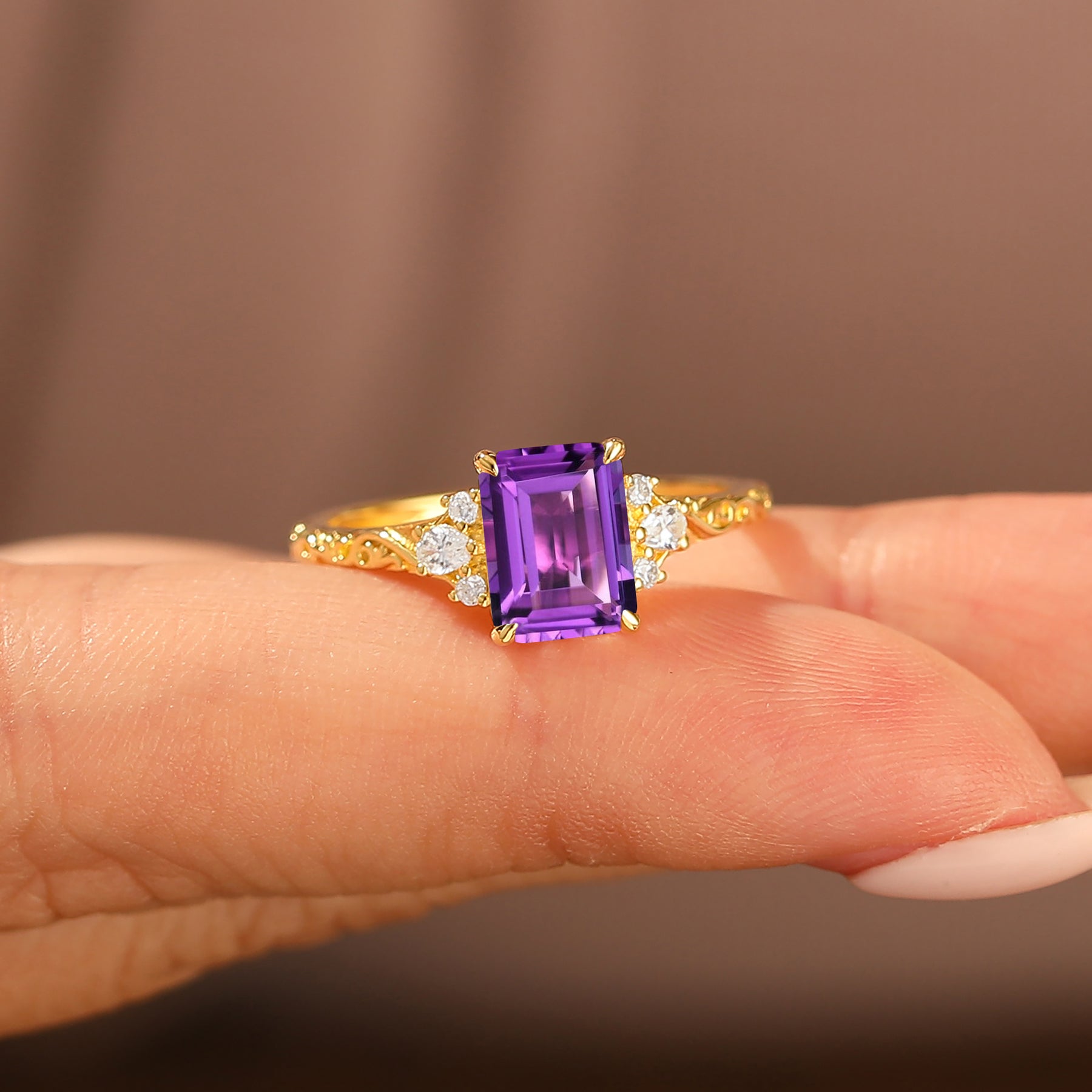 Unique 2CT Feuille inspirée Taille Émeraude Bague de fiançailles en or jaune 14 carats avec améthyste naturelle Bague de mariage en filigrane