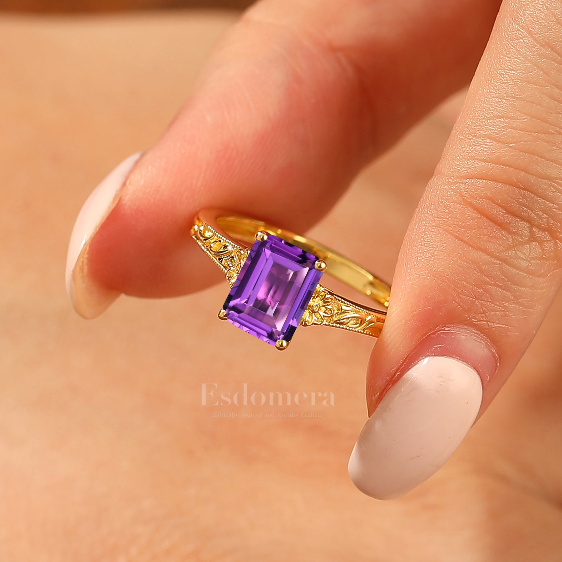 14K Solid Gold Solitaire 2CT Emerald Cut Filigreed Amethyst Bridal Ring Baroque-inspired Women Ring